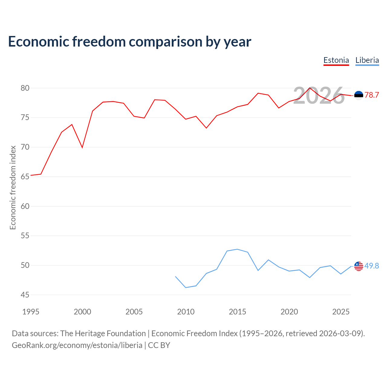 The Economic Freedom Index for Estonia is 78.7, ranking 10/197, compared to 49.8 for Liberia, ranking 163/197. The chart above displays a comparison of annual changes in economic freedom indexes.