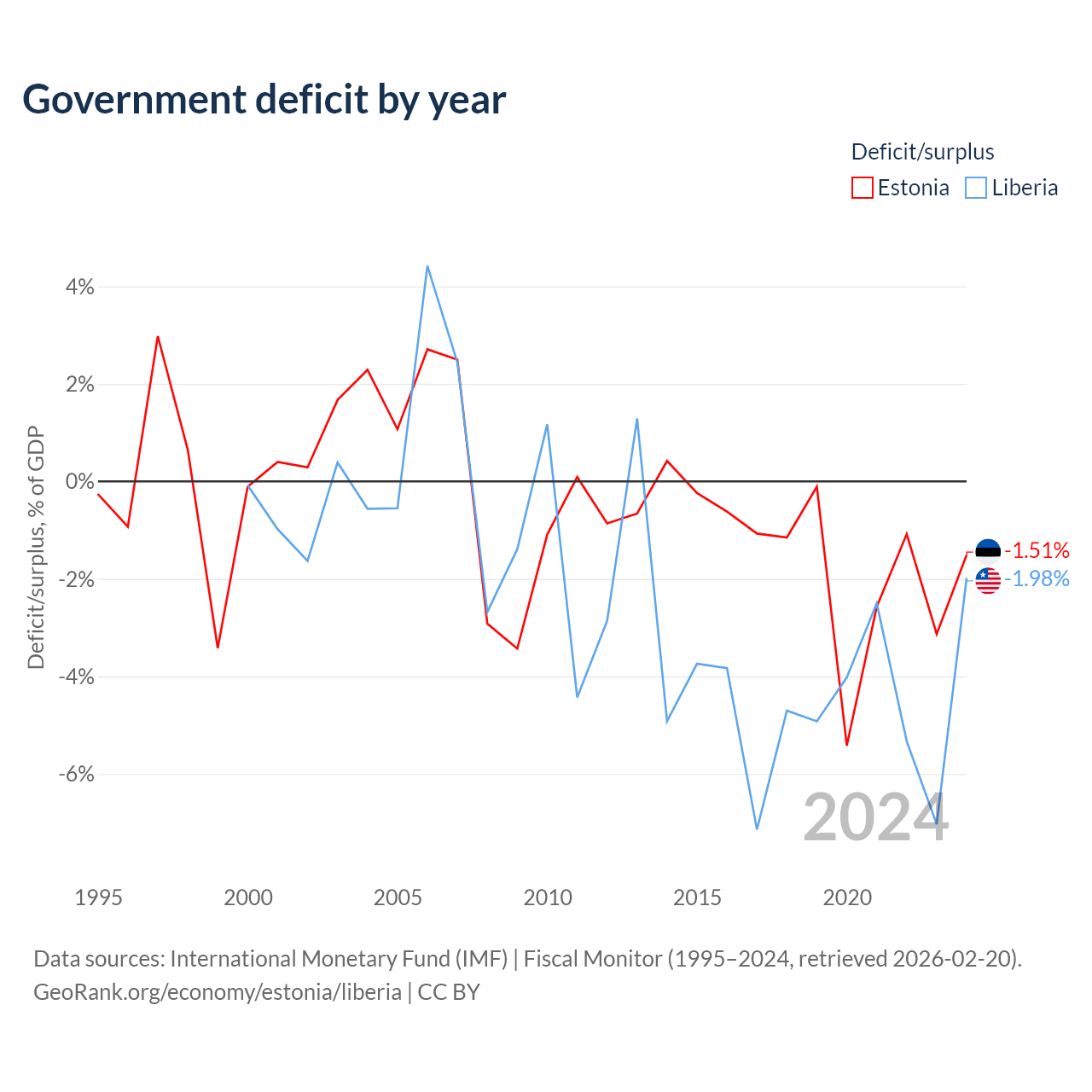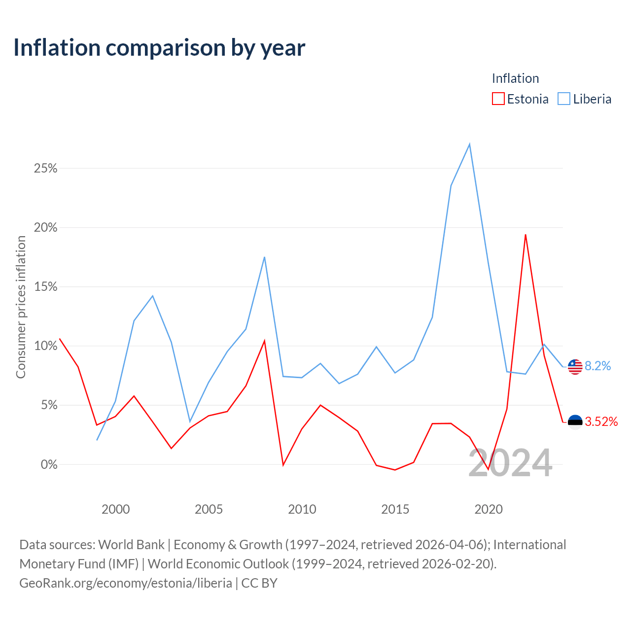 Estonia has a GDP of $43.1B compared to $4.78B for Liberia, ranking 100/197 and 163/197 by economy size, respectively.