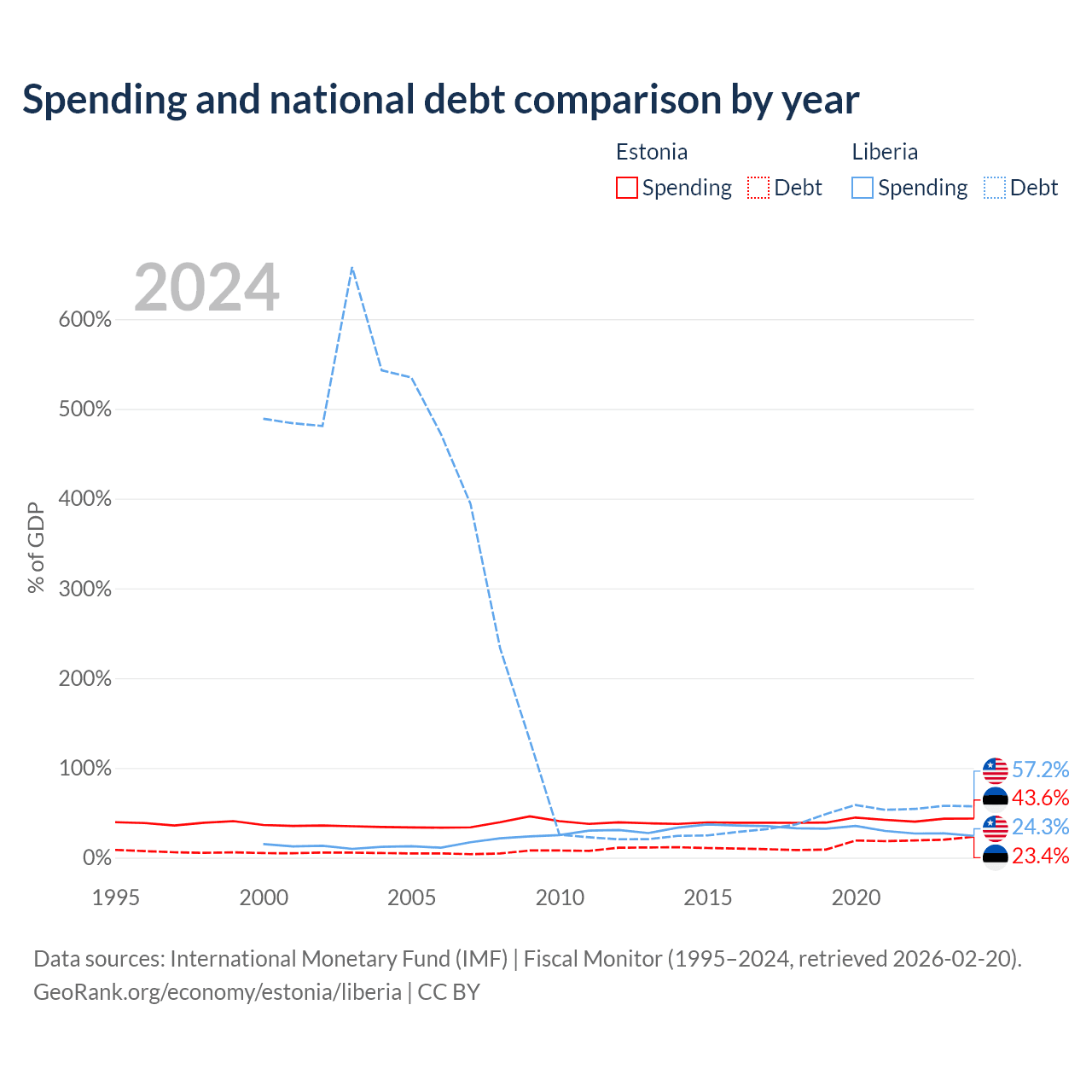 Estonia has $10.1B in government debt (23.4% of GDP), compared to $2.73B (57.2% of GDP) in Liberia.