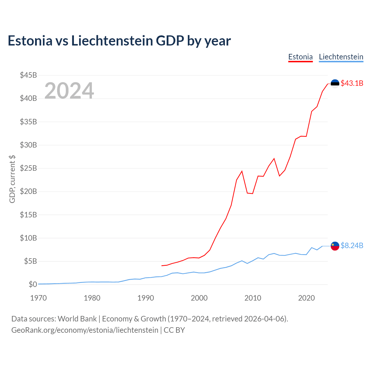 Estonia has a GDP of $43.1B compared to $8.24B for Liechtenstein, ranking 100/197 and 156/197 by economy size, respectively.