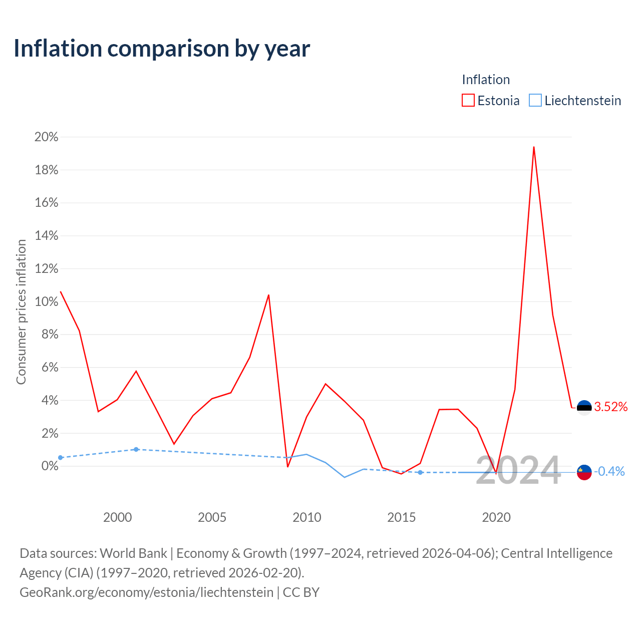 Over the past 24 years, Estonia has recorded an average annual inflation rate of 3.67%, compared with 0.04% in Liechtenstein. In 2020, inflation was 3.52% in Estonia and -0.4% in Liechtenstein.