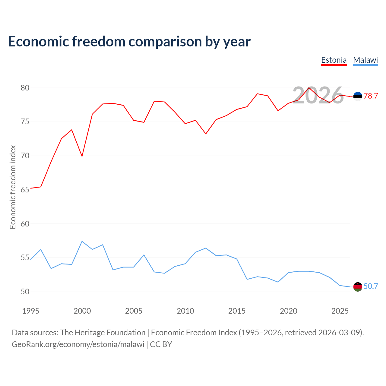 The Economic Freedom Index for Estonia is 78.7, ranking 10/197, compared to 50.7 for Malawi, ranking 159/197. The chart above displays a comparison of annual changes in economic freedom indexes.