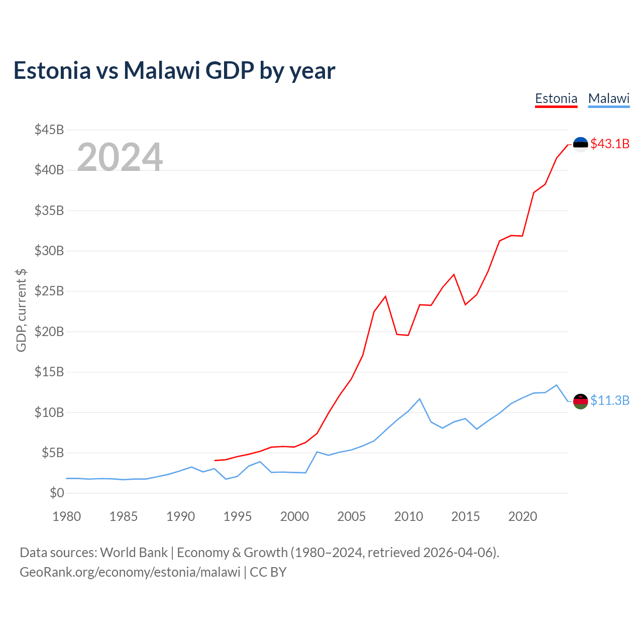 Estonia vs Malawi GDP by year