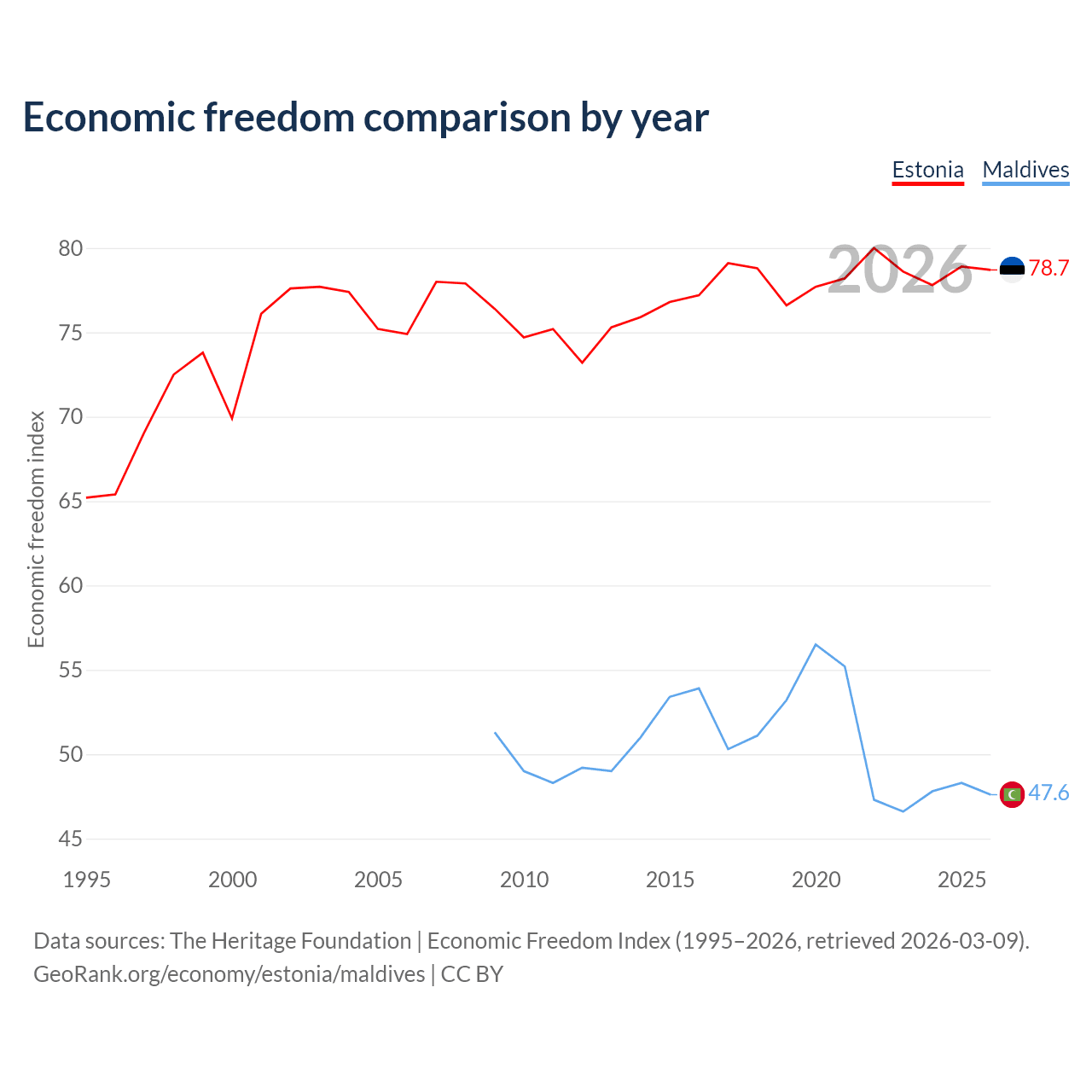 The Economic Freedom Index for Estonia is 78.7, ranking 10/197, compared to 47.6 for Maldives, ranking 174/197. The chart above displays a comparison of annual changes in economic freedom indexes.