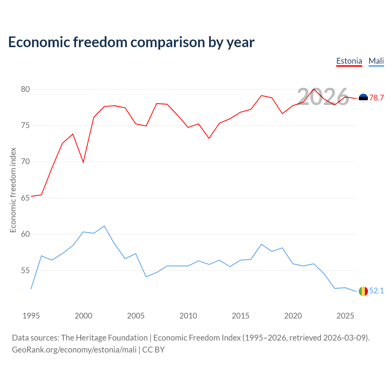 The Economic Freedom Index for Estonia is 78.7, ranking 10/197, compared to 52.1 for Mali, ranking 150/197. The chart above displays a comparison of annual changes in economic freedom indexes.
