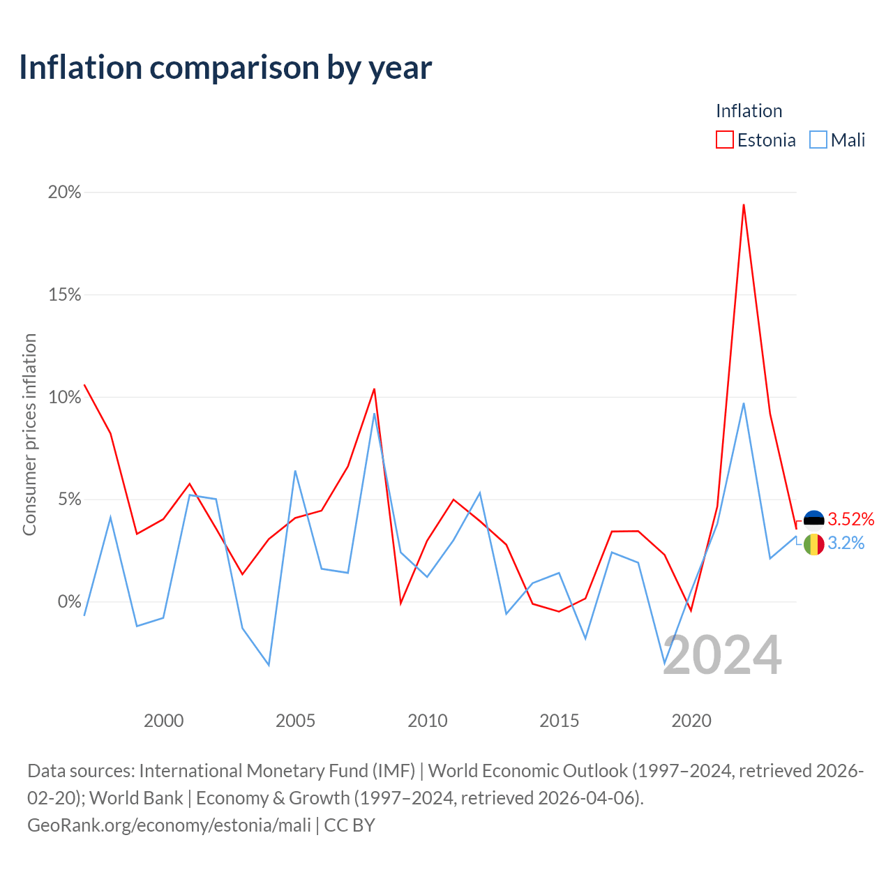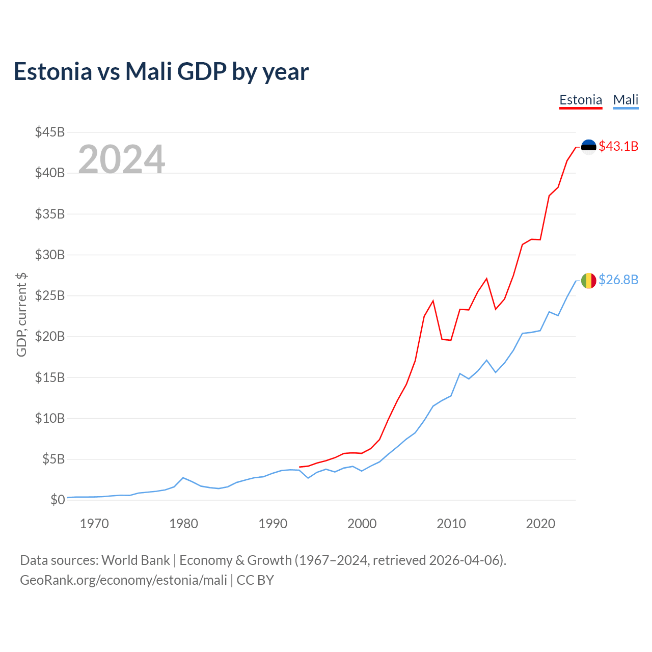 Estonia has a GDP of $43.1B compared to $26.8B for Mali, ranking 100/197 and 113/197 by economy size, respectively.