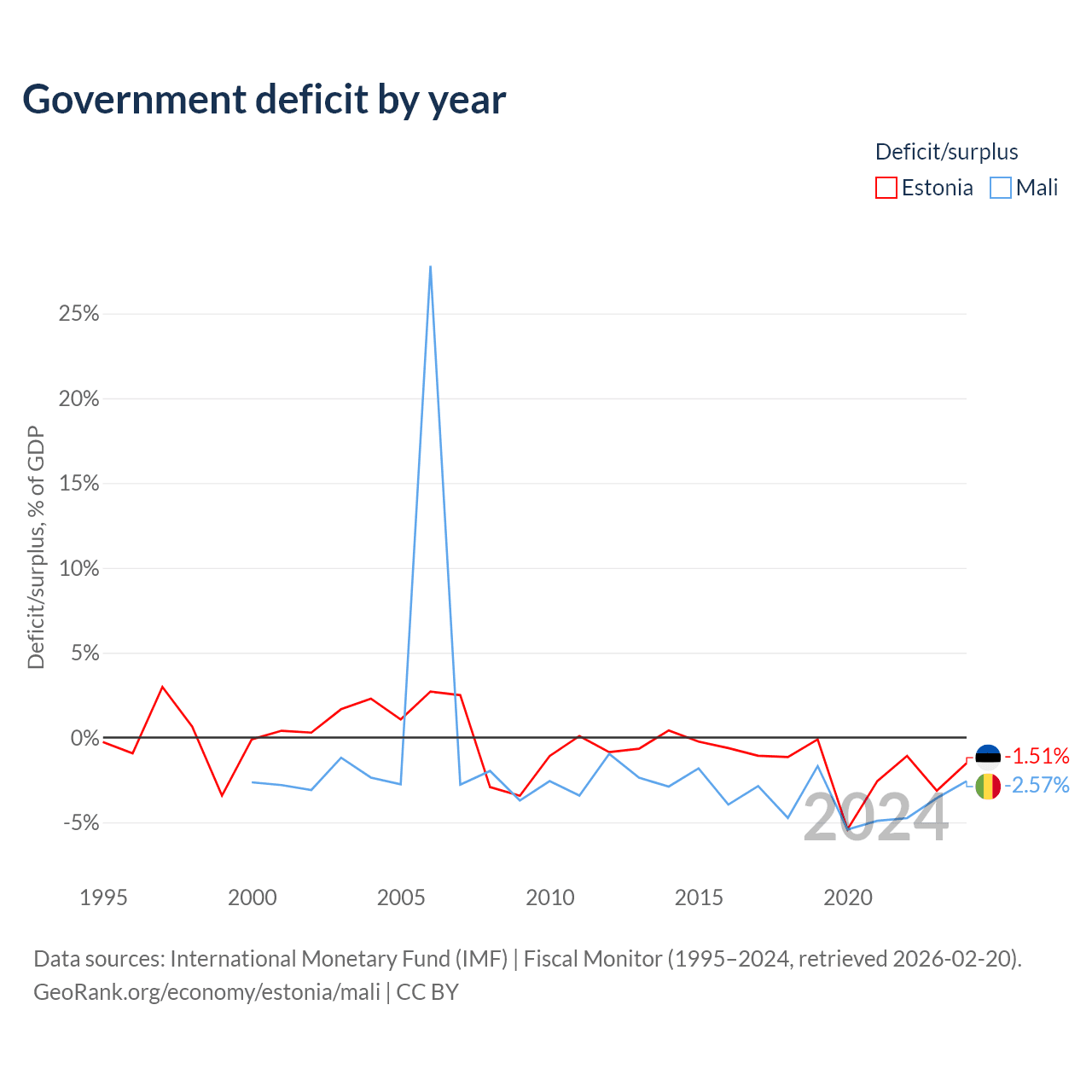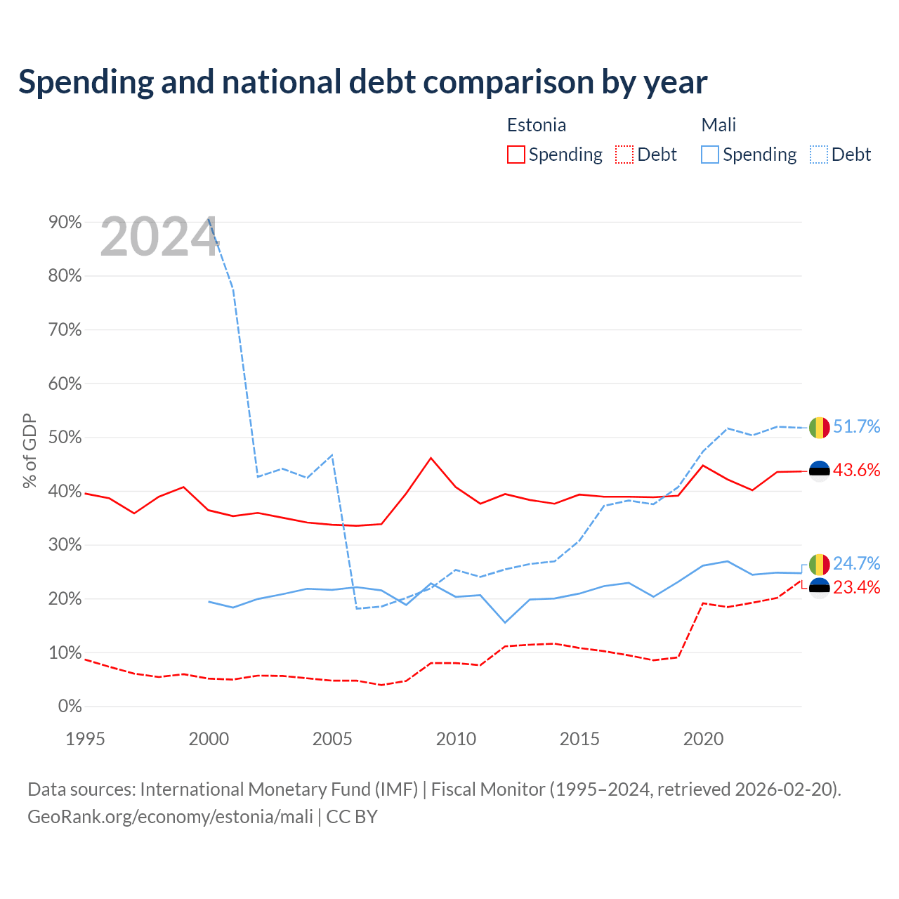 Estonia has $10.1B in government debt (23.4% of GDP), compared to $13.9B (51.7% of GDP) in Mali.
