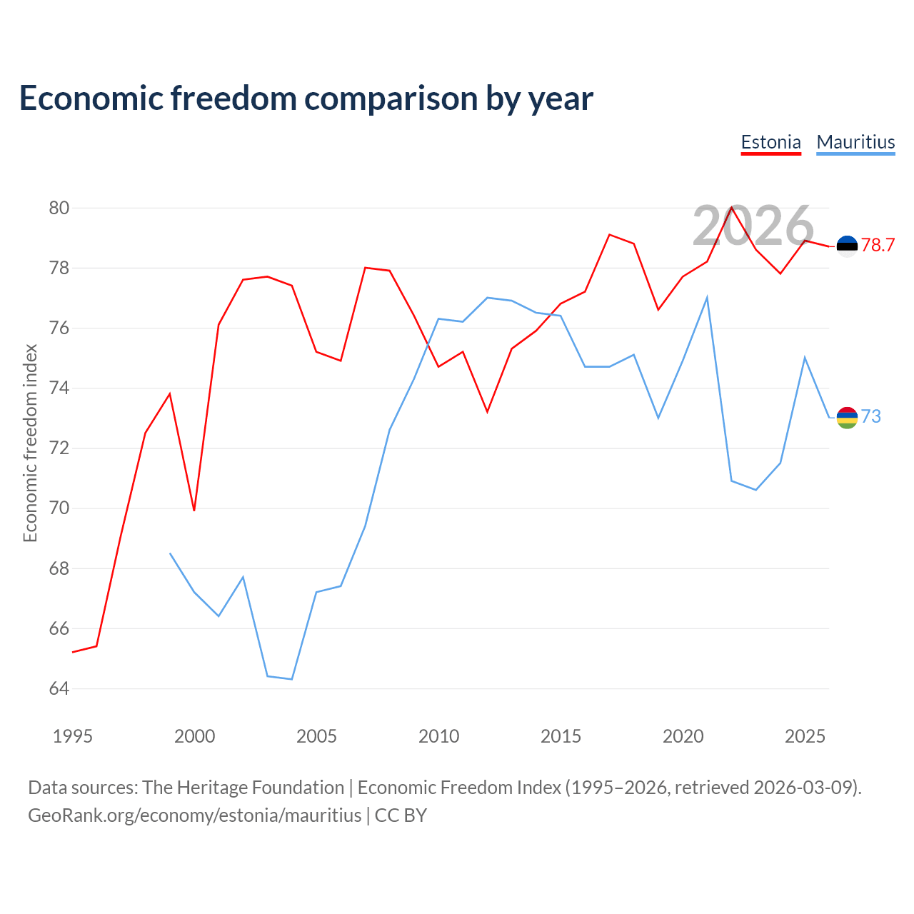 The Economic Freedom Index for Estonia is 78.7, ranking 10/197, compared to 73 for Mauritius, ranking 26/197. The chart above displays a comparison of annual changes in economic freedom indexes.