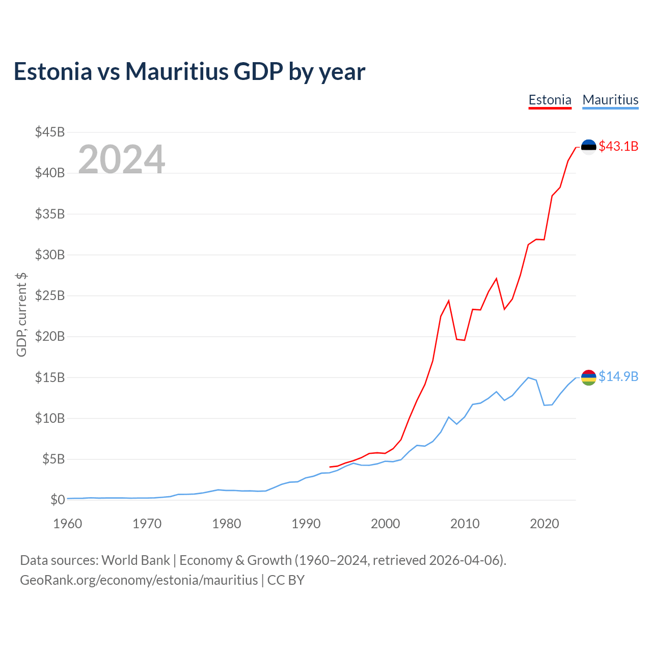 Estonia has a GDP of $43.1B compared to $14.9B for Mauritius, ranking 100/197 and 143/197 by economy size, respectively.