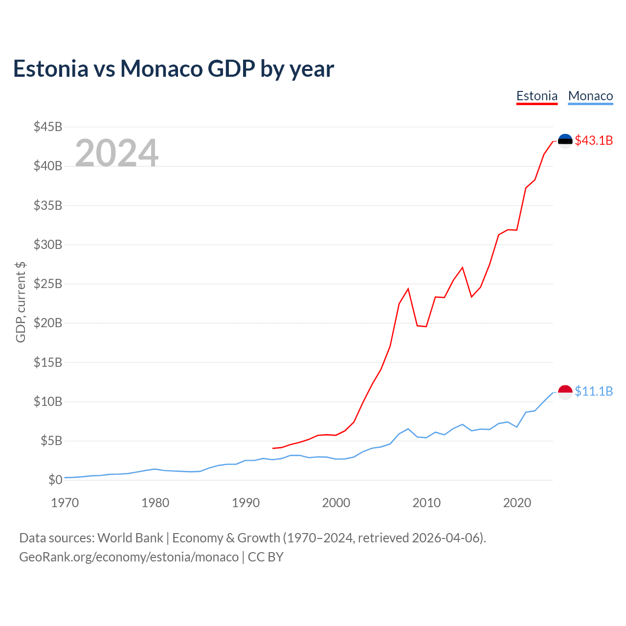 Estonia has a GDP of $43.1B compared to $11.1B for Monaco, ranking 100/197 and 152/197 by economy size, respectively.