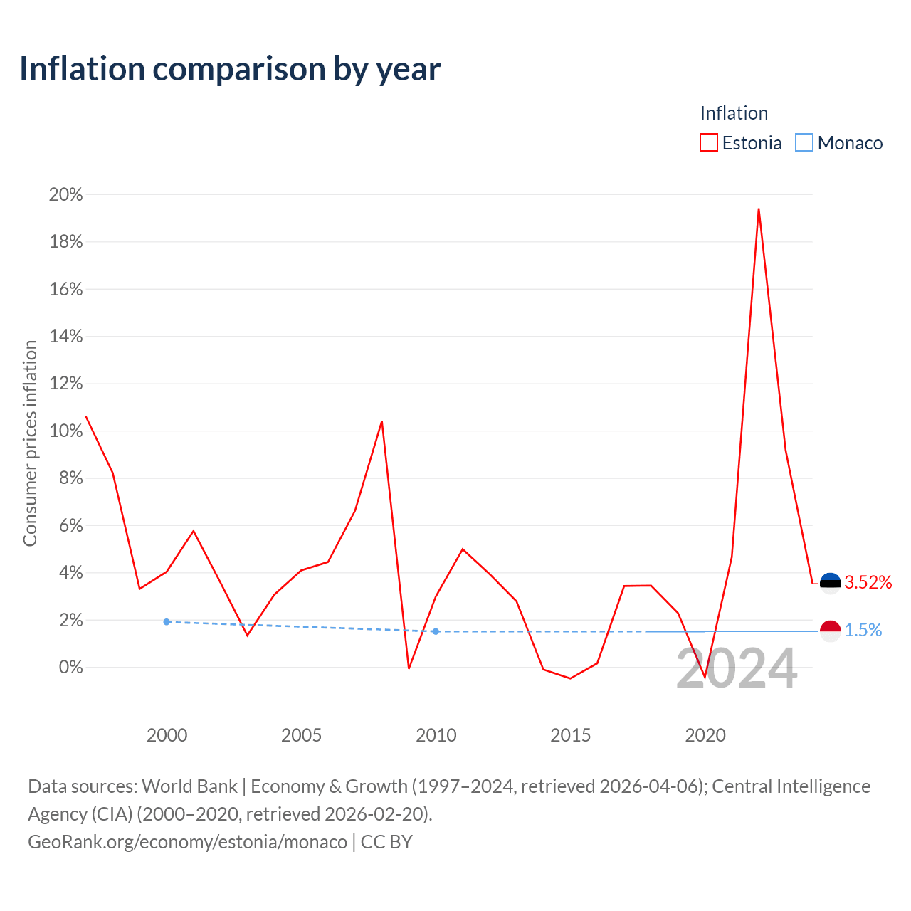 Over the past 21 years, Estonia has recorded an average annual inflation rate of 3.14%, compared with 1.58% in Monaco. In 2020, inflation was 3.52% in Estonia and 1.5% in Monaco.