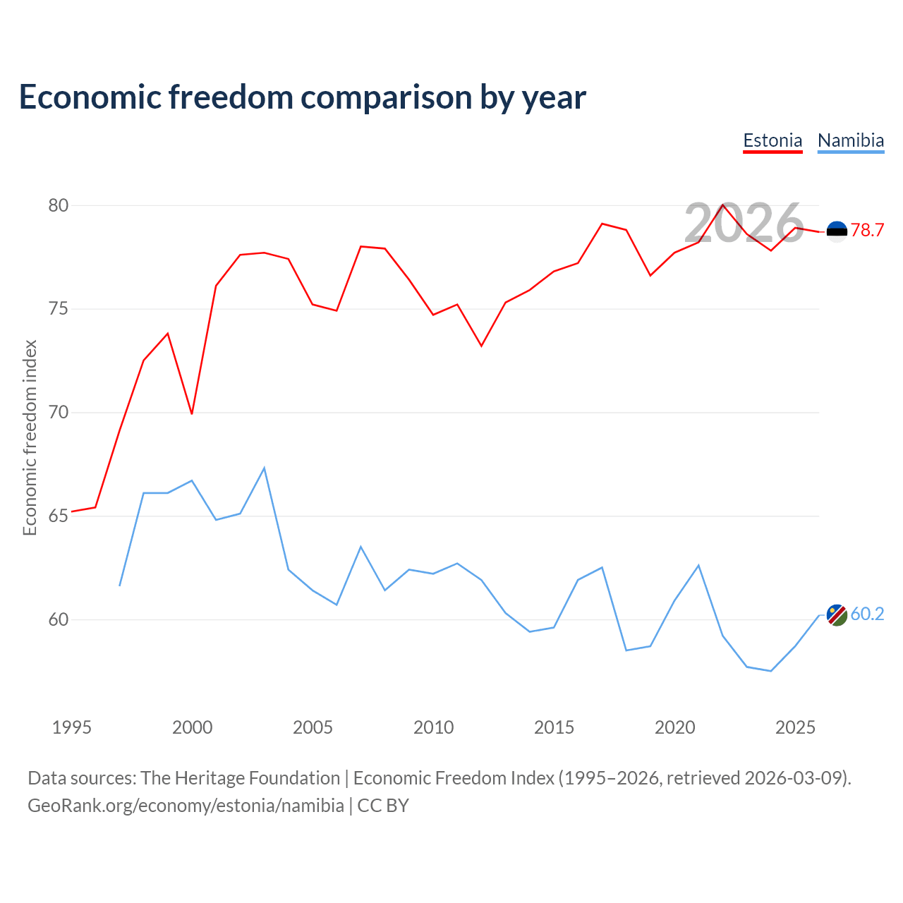 The Economic Freedom Index for Estonia is 78.7, ranking 10/197, compared to 60.2 for Namibia, ranking 95/197. The chart above displays a comparison of annual changes in economic freedom indexes.