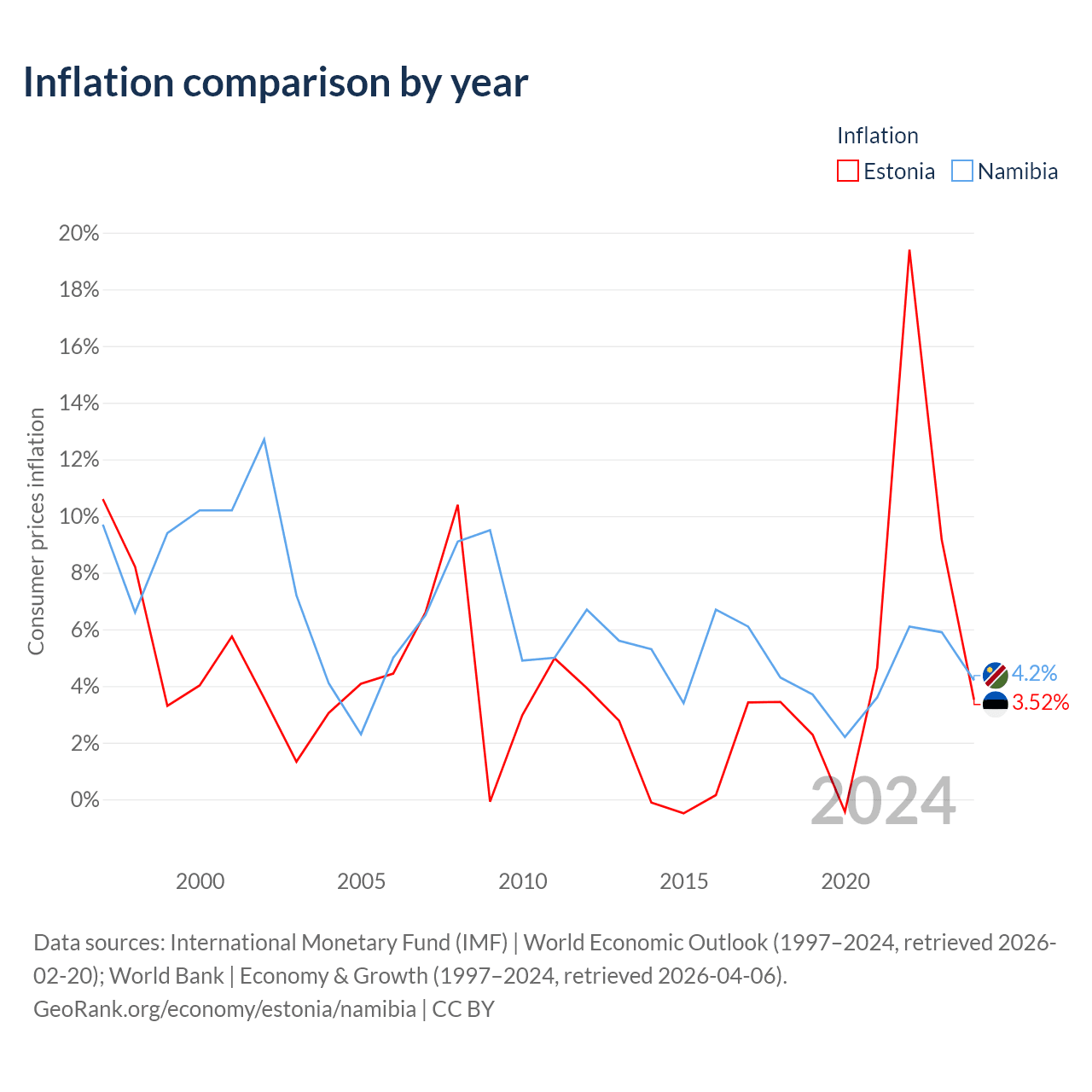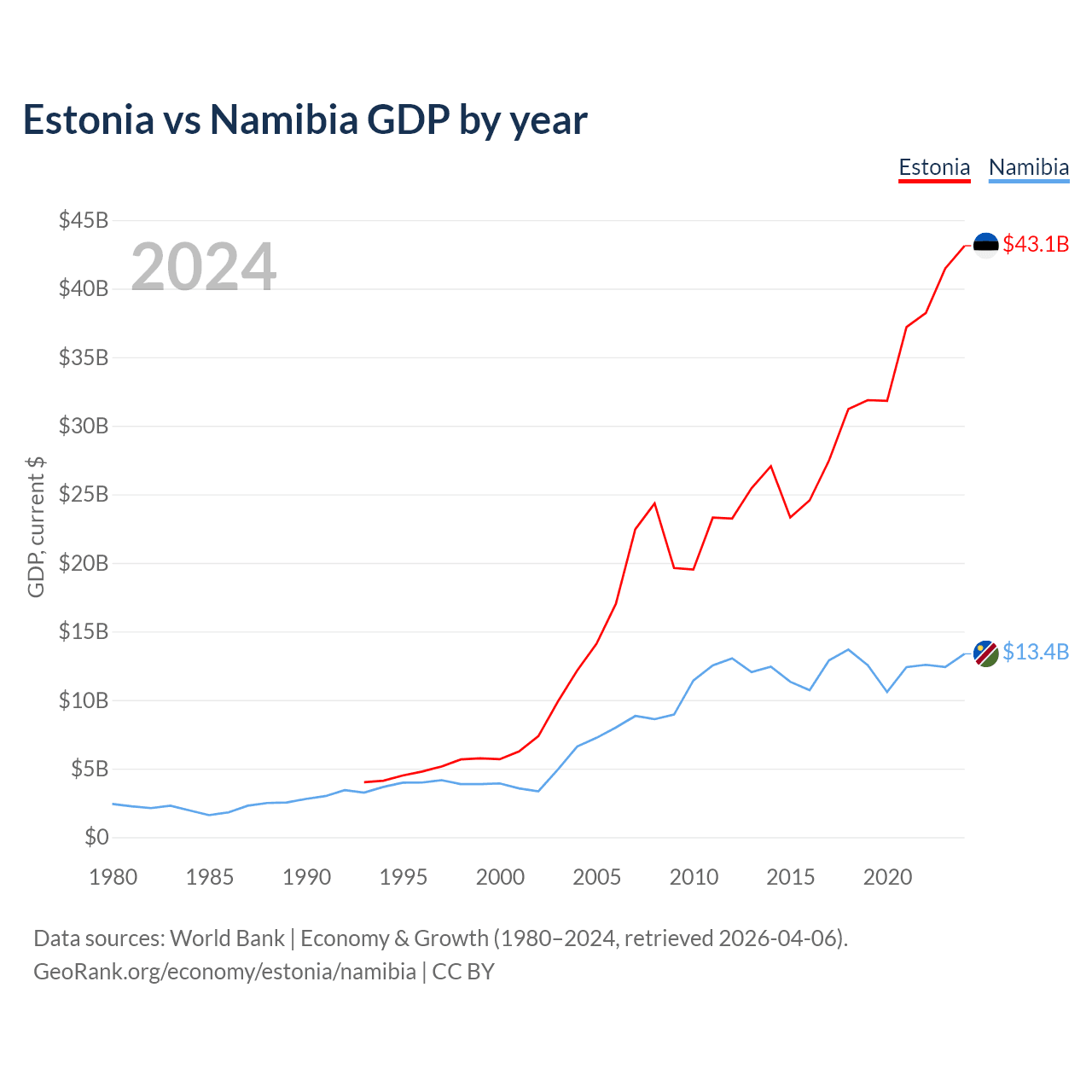 Estonia has a GDP of $43.1B compared to $13.4B for Namibia, ranking 100/197 and 147/197 by economy size, respectively.