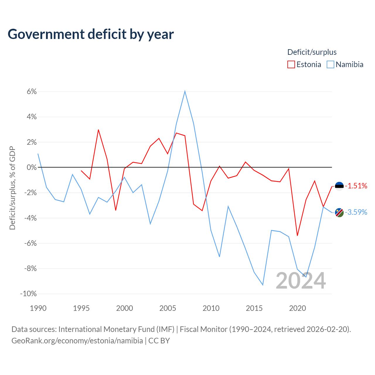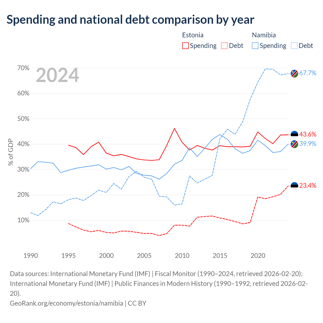 Estonia has $10.1B in government debt (23.4% of GDP), compared to $9.05B (67.7% of GDP) in Namibia.