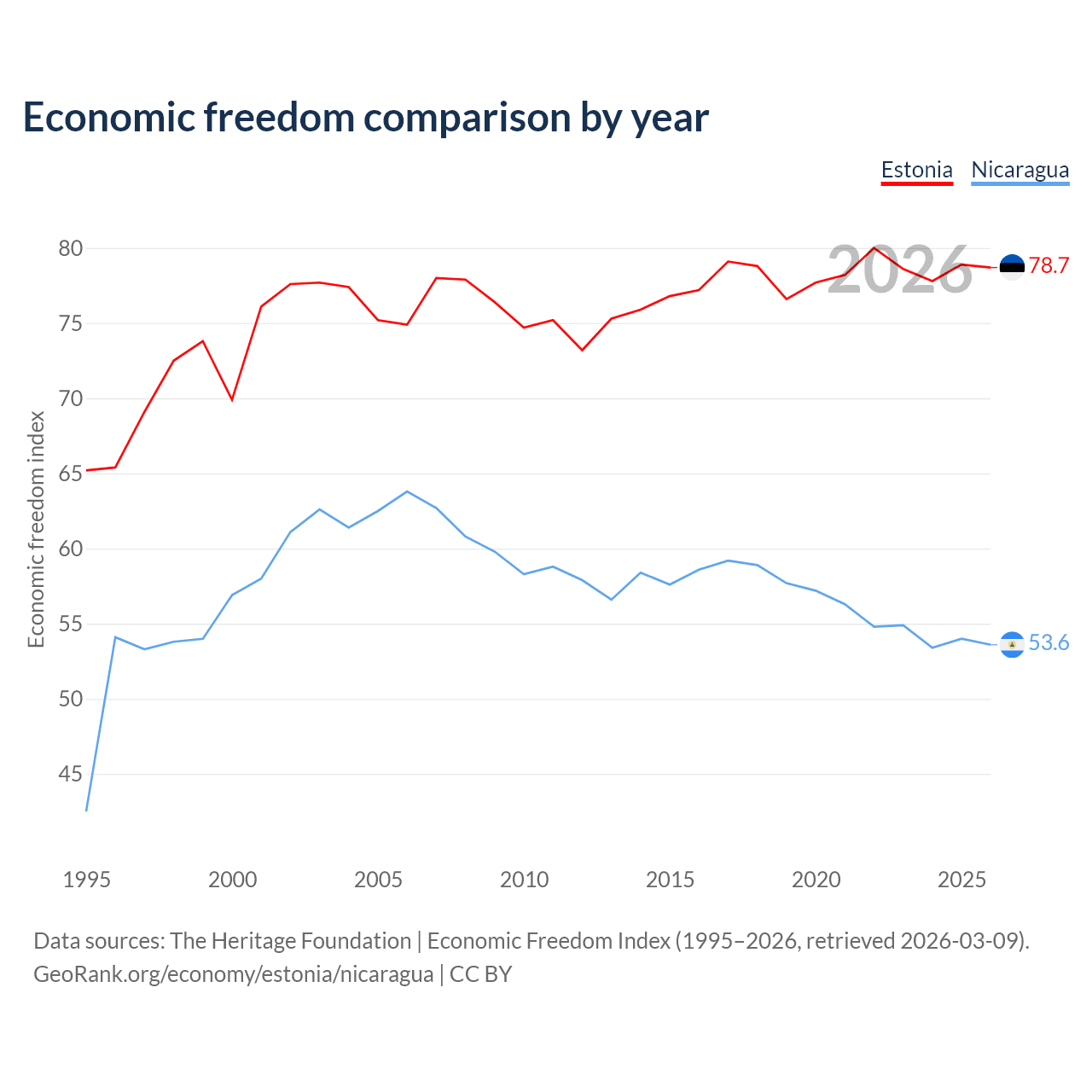 Data sources: The Heritage Foundation | Economic Freedom Index (1995–2026, retrieved 2026-03-09).