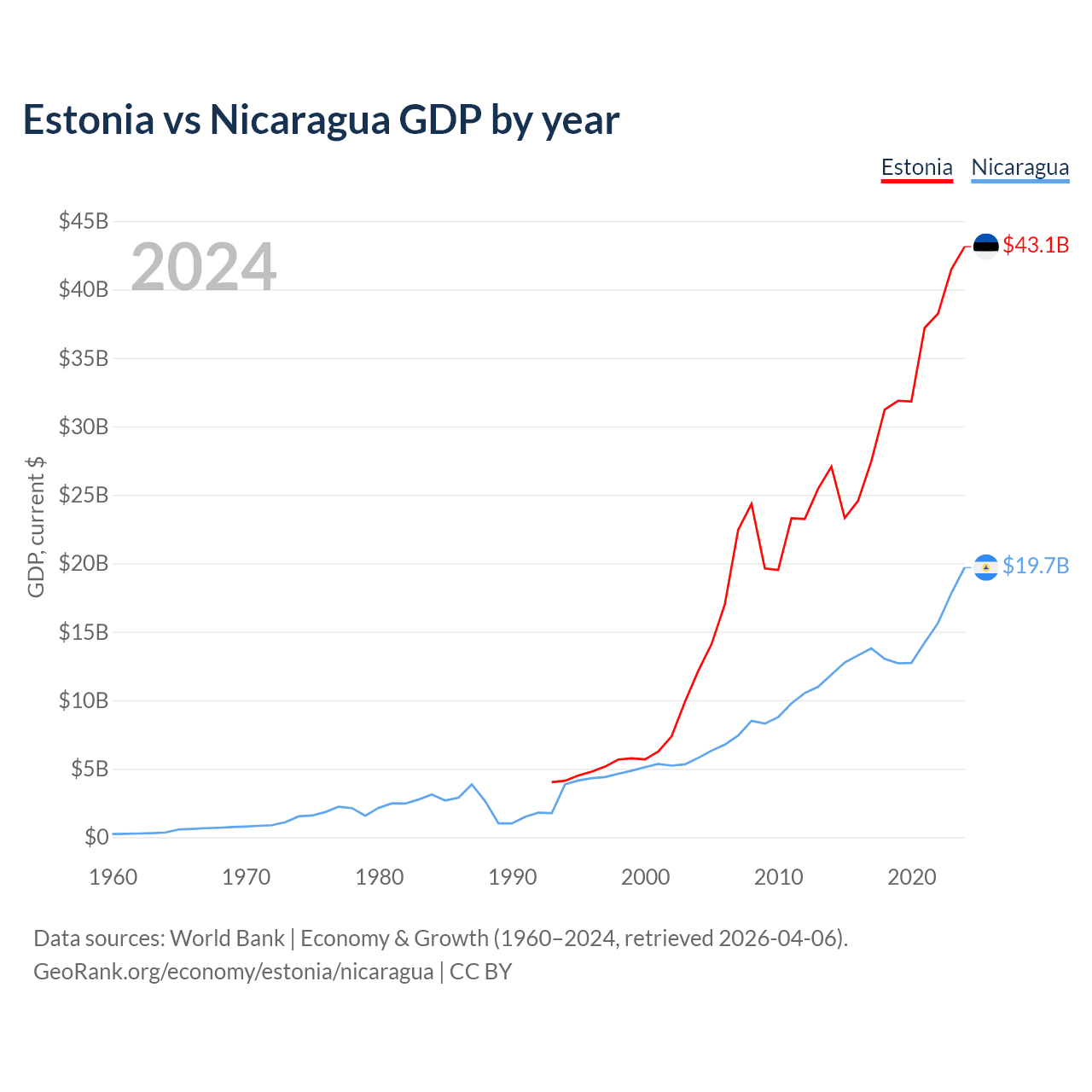 Estonia has a GDP of $43.1B compared to $19.7B for Nicaragua, ranking 100/197 and 131/197 by economy size, respectively.