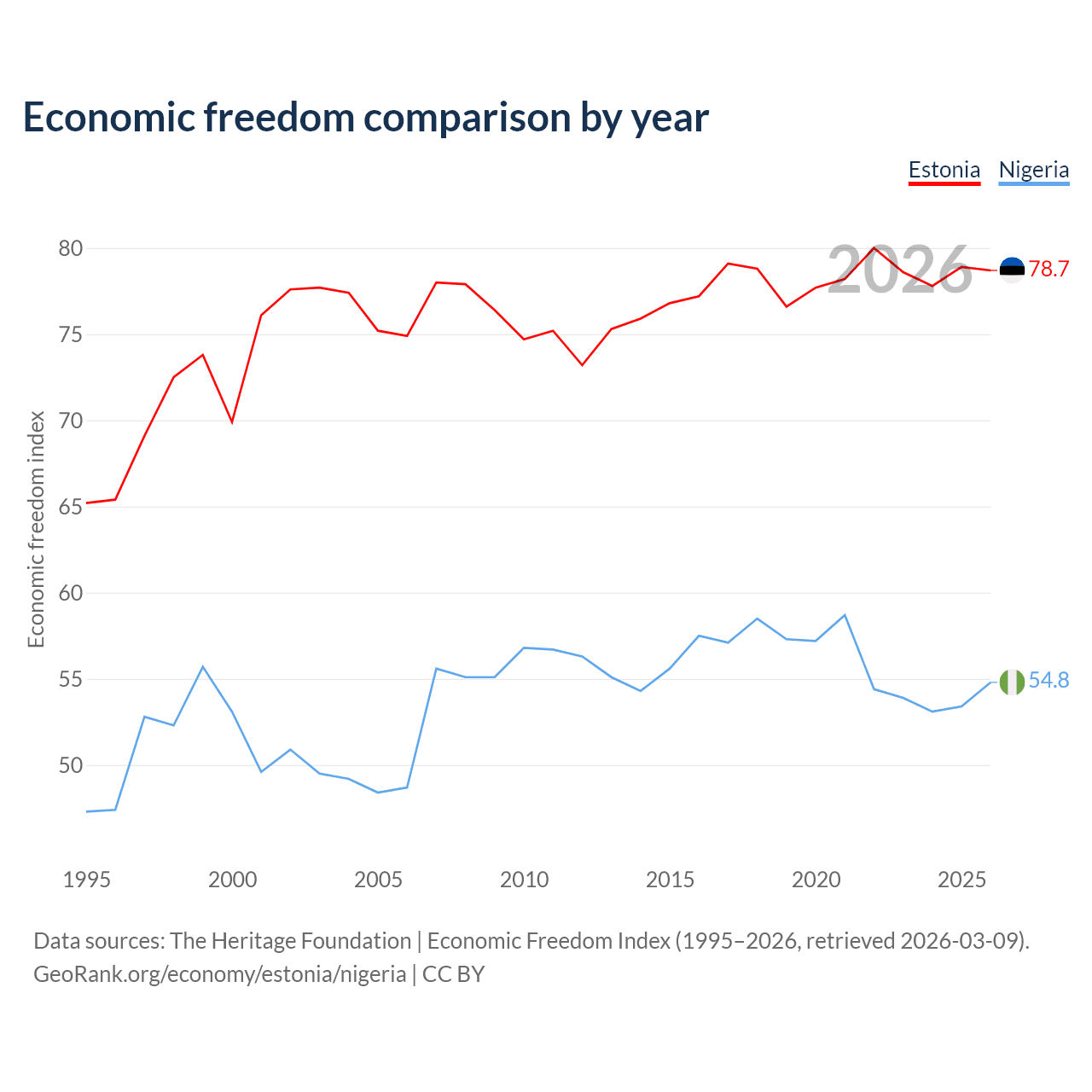 The Economic Freedom Index for Estonia is 78.7, ranking 10/197, compared to 54.8 for Nigeria, ranking 132/197. The chart above displays a comparison of annual changes in economic freedom indexes.
