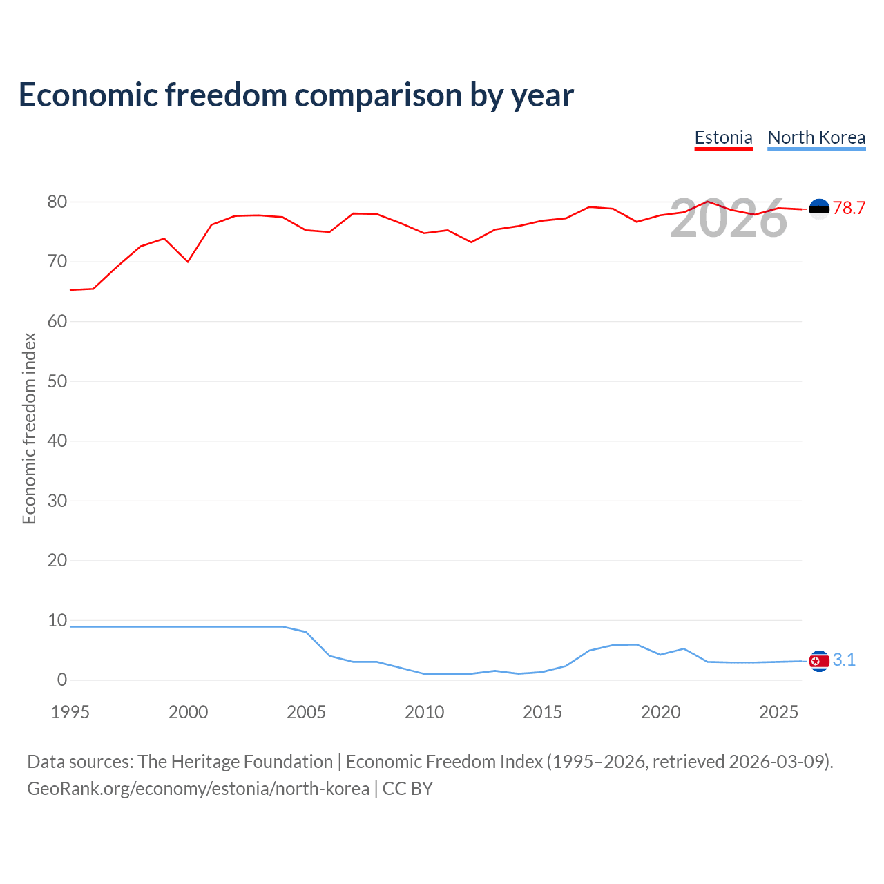 The Economic Freedom Index for Estonia is 78.7, ranking 10/197, compared to 3.1 for North Korea, ranking 197/197. The chart above displays a comparison of annual changes in economic freedom indexes.