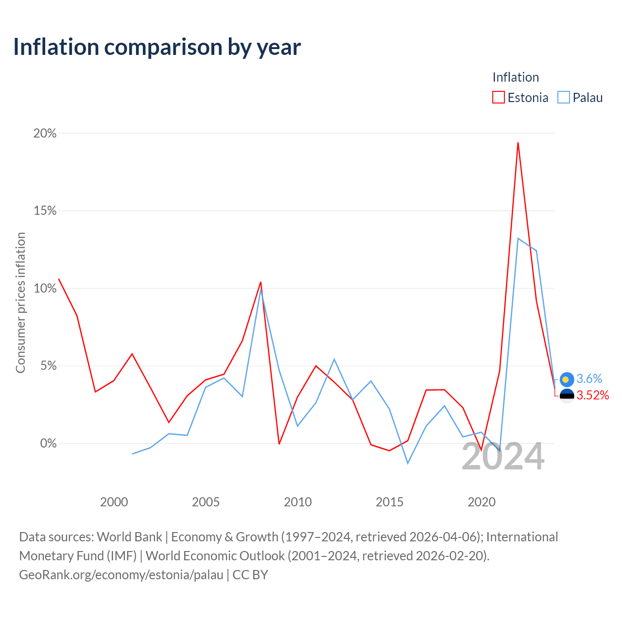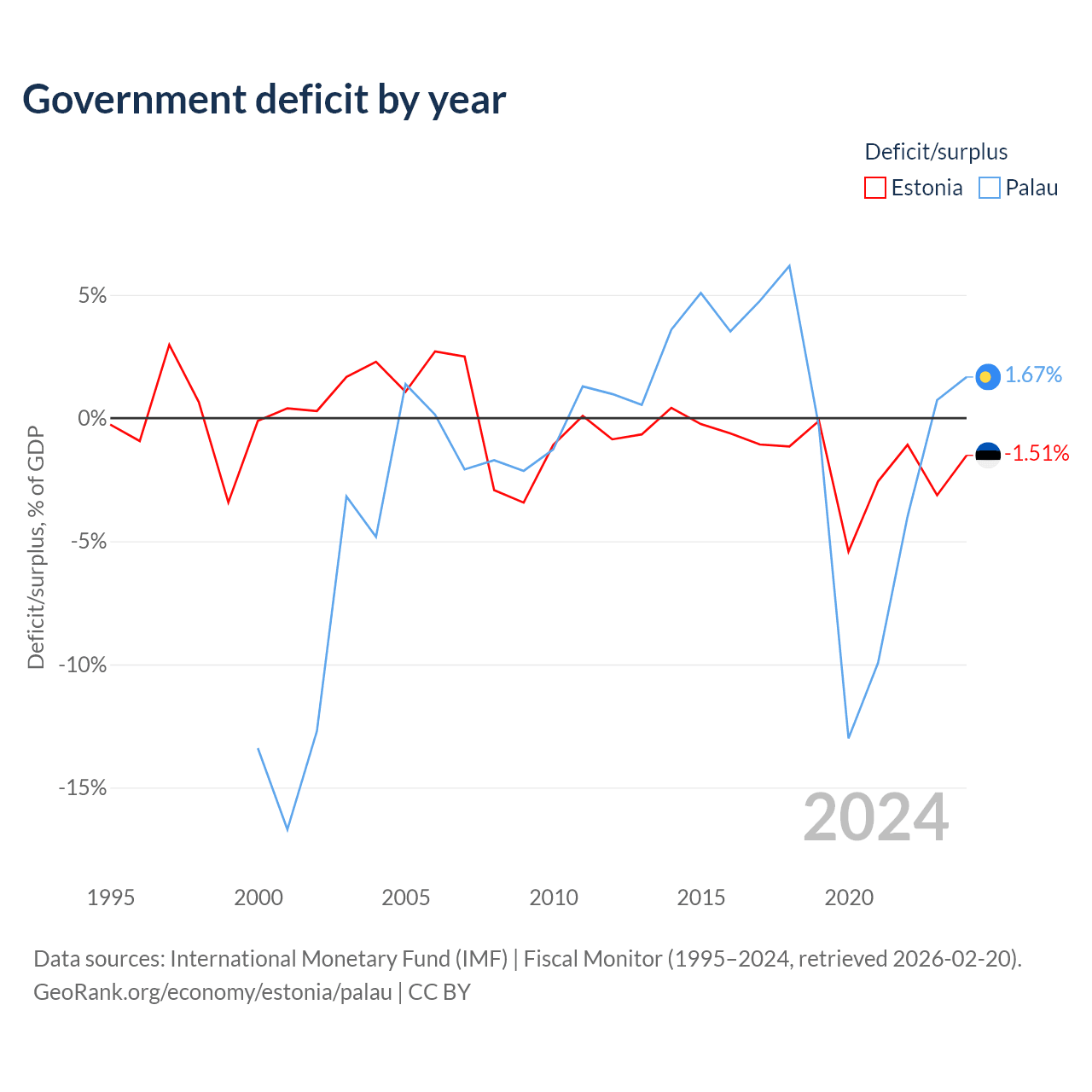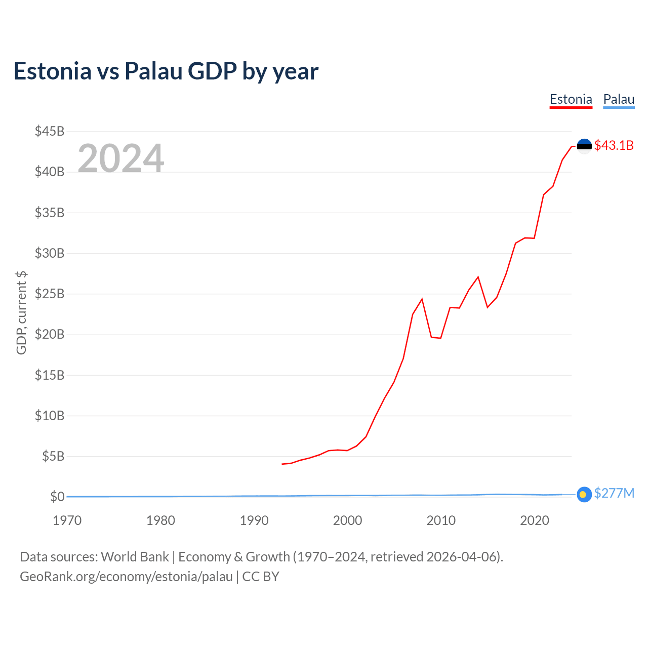 Estonia has a GDP of $43.1B compared to $277M for Palau, ranking 100/197 and 194/197 by economy size, respectively.
