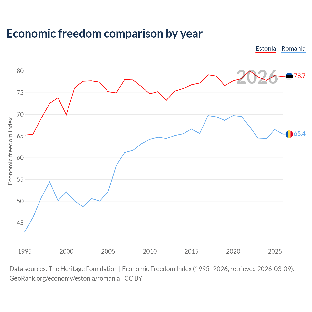 The Economic Freedom Index for Estonia is 78.7, ranking 10/197, compared to 65.4 for Romania, ranking 64/197. The chart above displays a comparison of annual changes in economic freedom indexes.