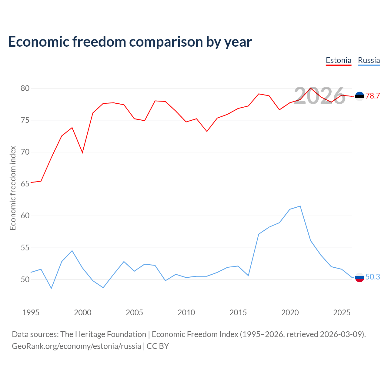 The Economic Freedom Index for Estonia is 78.7, ranking 10/197, compared to 50.3 for Russia, ranking 161/197. The chart above displays a comparison of annual changes in economic freedom indexes.
