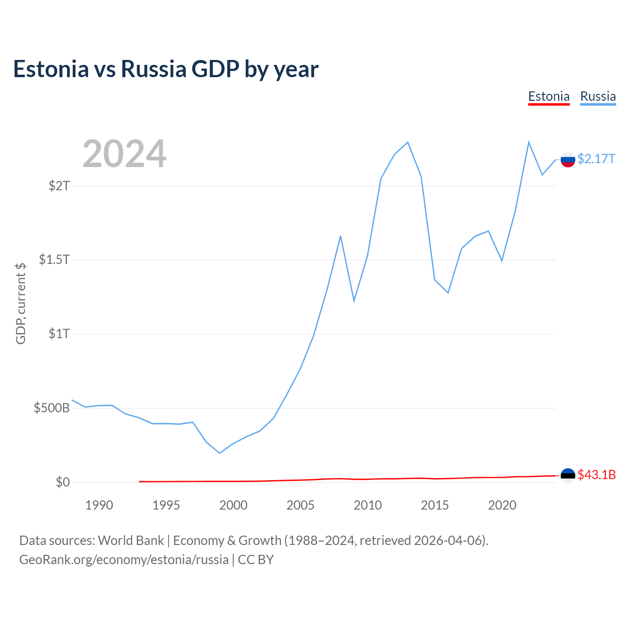Estonia has a GDP of $43.1B compared to $2.17T for Russia, ranking 100/197 and 11/197 by economy size, respectively.