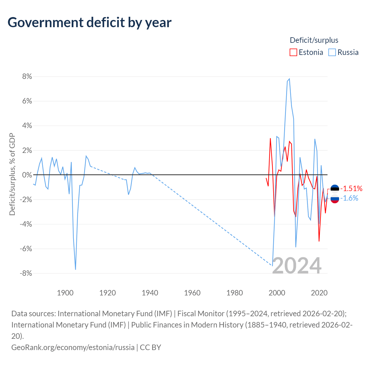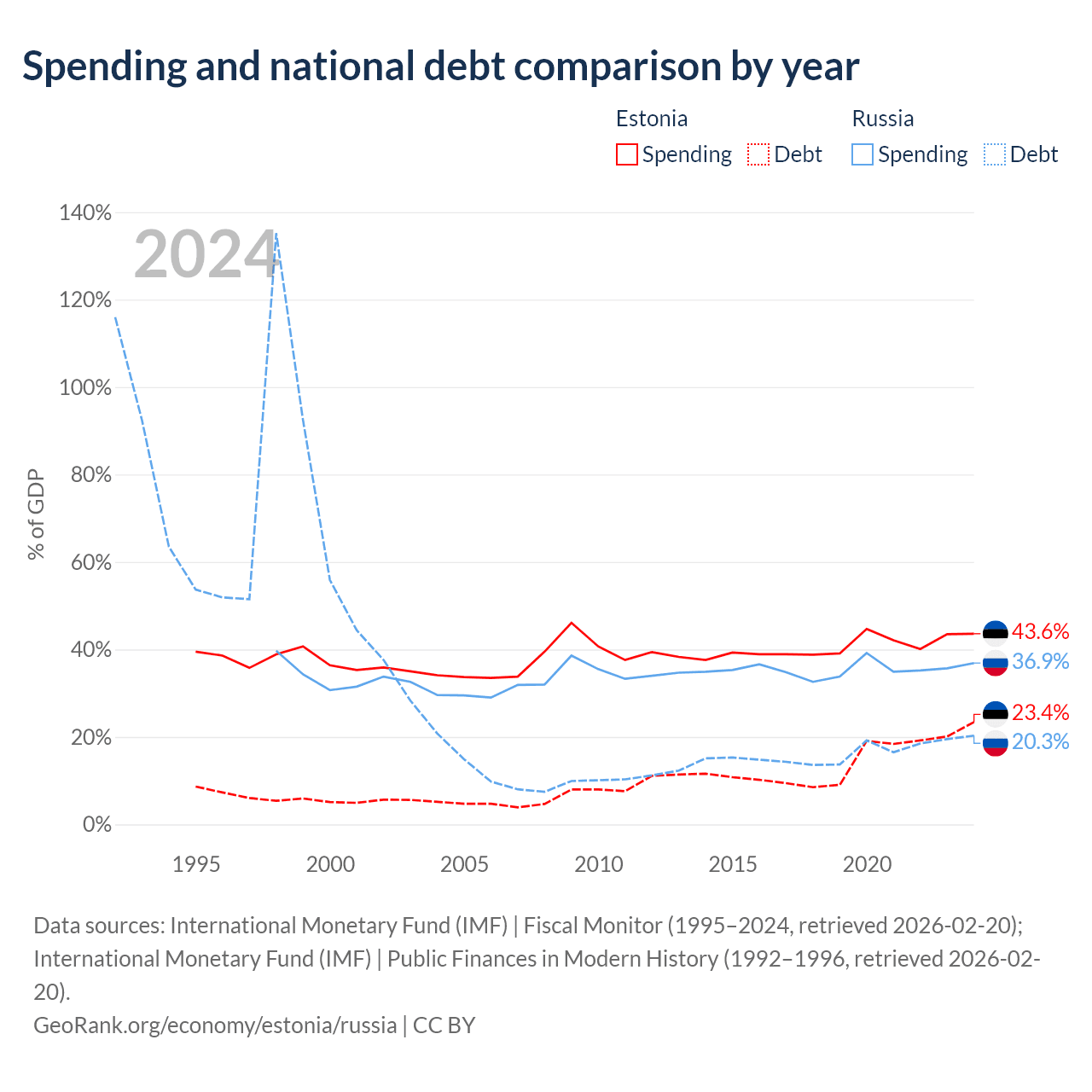 Estonia has $10.1B in government debt (23.4% of GDP), compared to $440B (20.3% of GDP) in Russia.