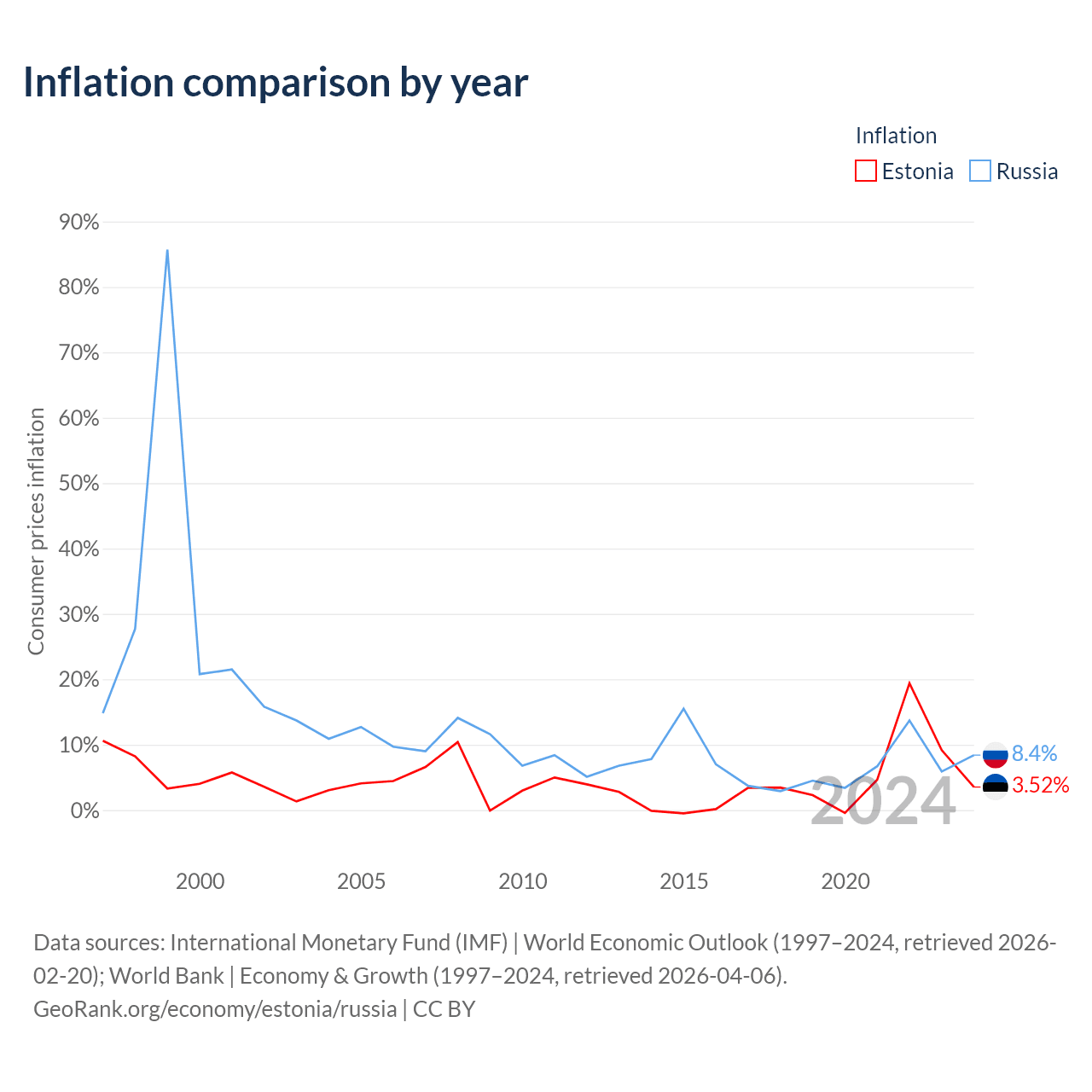 Estonia's GDP per capita is $31,428, ranking 40/197, compared to $15,145 in Russia, ranking 68/197. Adjusted for purchasing power (GDP per capita PPP), Estonia ranks 45th at $49,969, while Russia ranks 50th at $47,405.
