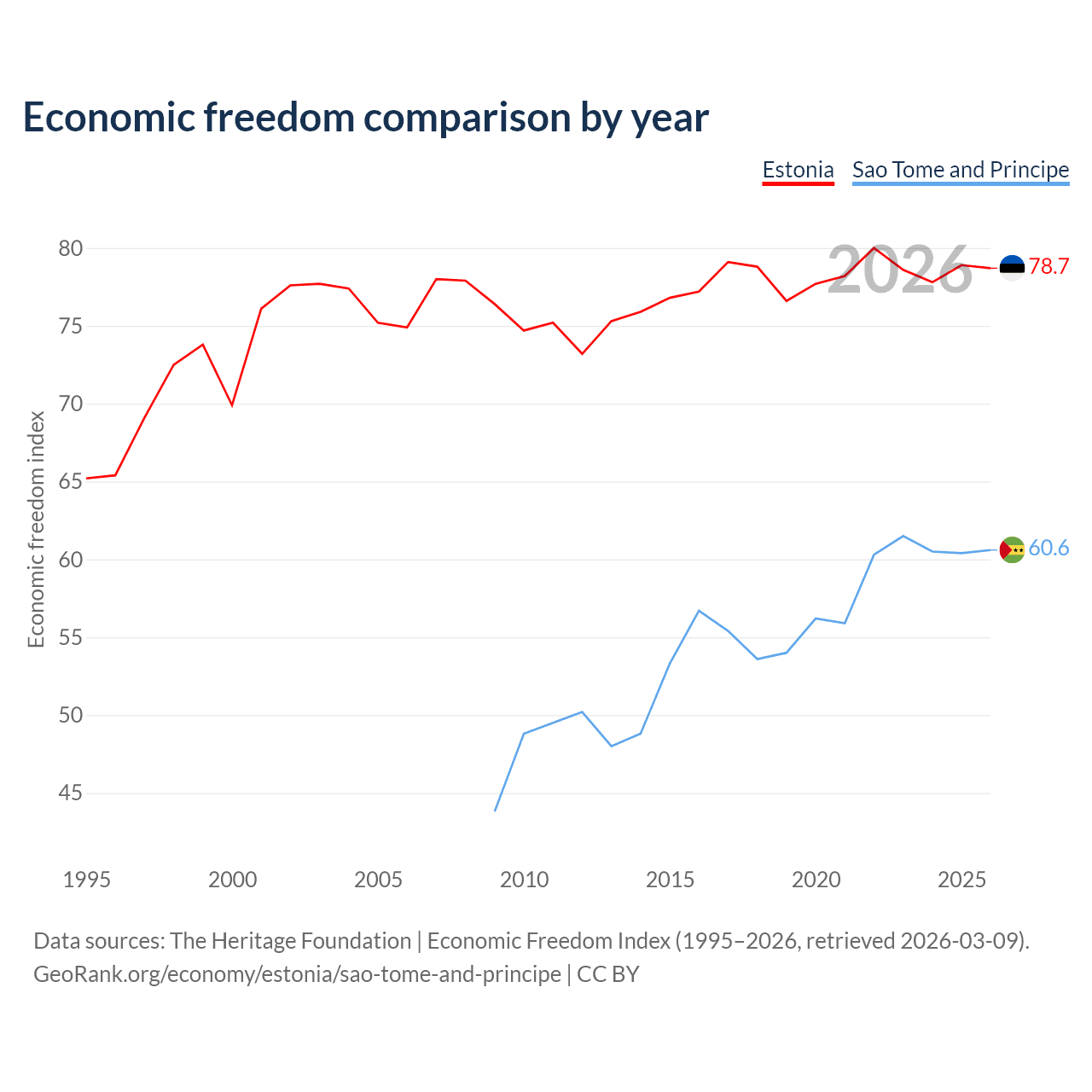 The Economic Freedom Index for Estonia is 78.7, ranking 10/197, compared to 60.6 for Sao Tome and Principe, ranking 93/197. The chart above displays a comparison of annual changes in economic freedom indexes.