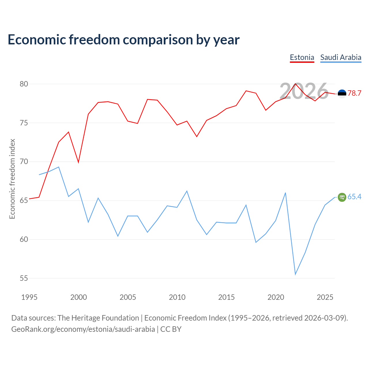 The Economic Freedom Index for Estonia is 78.7, ranking 10/197, compared to 65.4 for Saudi Arabia, ranking 65/197. The chart above displays a comparison of annual changes in economic freedom indexes.