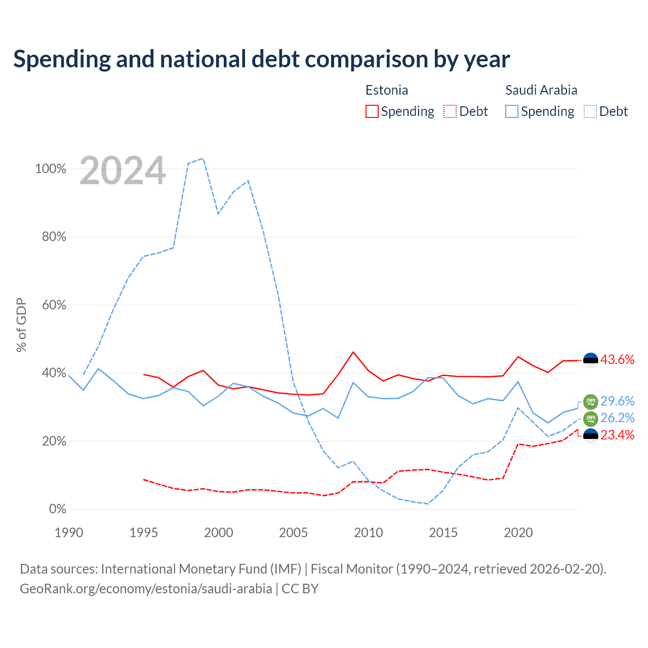 Estonia has $10.1B in government debt (23.4% of GDP), compared to $324B (26.2% of GDP) in Saudi Arabia.