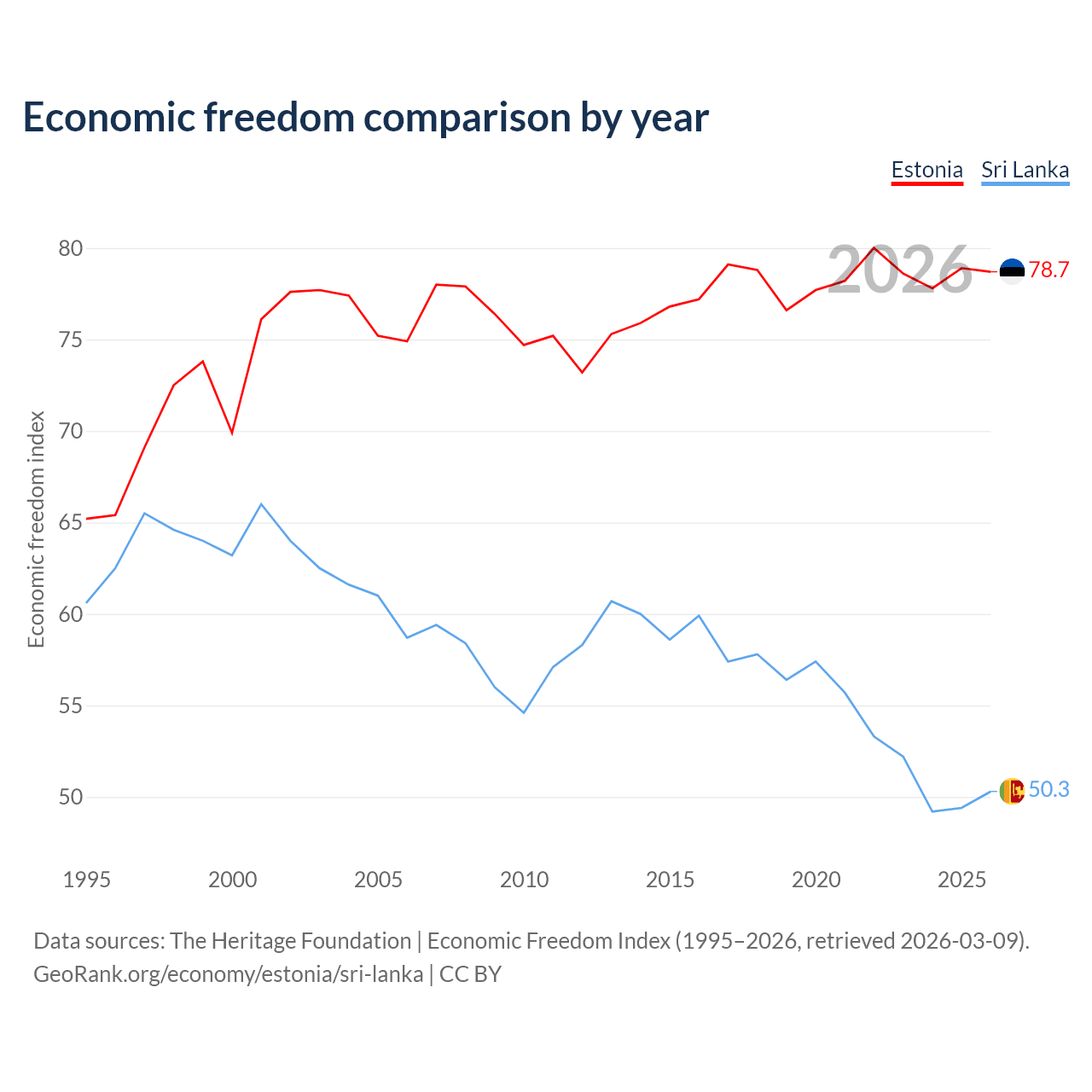 The Economic Freedom Index for Estonia is 78.7, ranking 10/197, compared to 50.3 for Sri Lanka, ranking 162/197. The chart above displays a comparison of annual changes in economic freedom indexes.