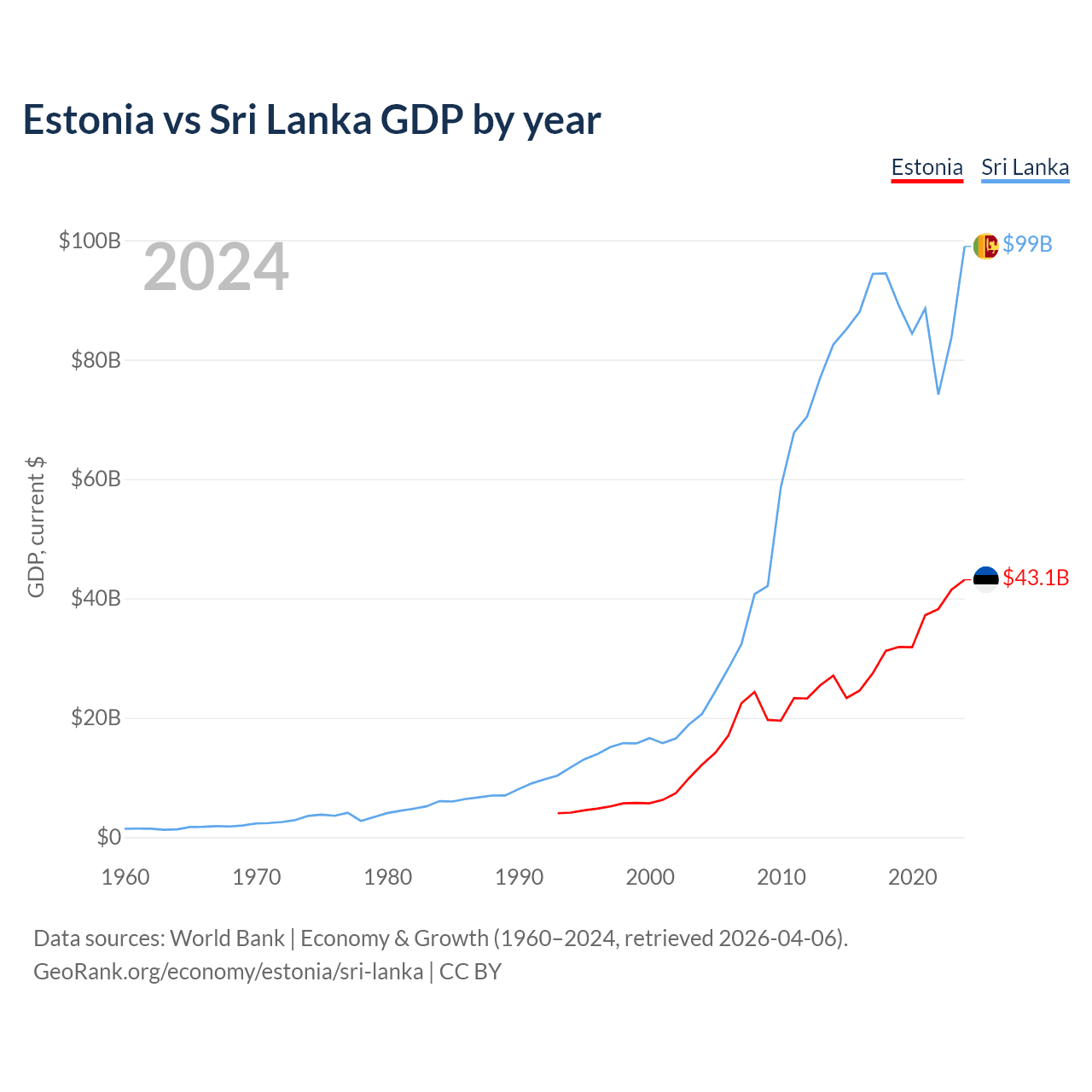 Estonia has a GDP of $43.1B compared to $99B for Sri Lanka, ranking 100/197 and 72/197 by economy size, respectively.