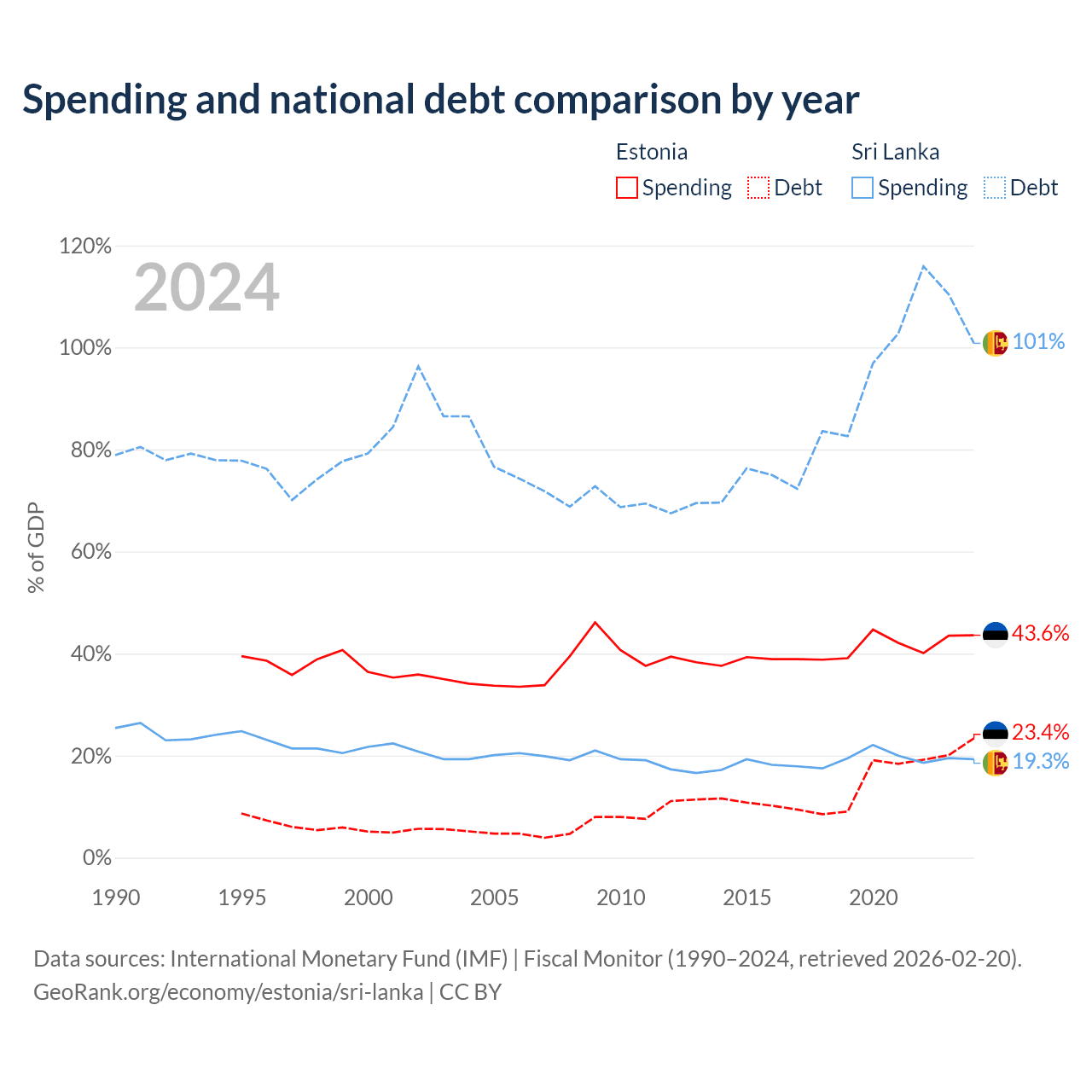 Estonia has $10.1B in government debt (23.4% of GDP), compared to $99.8B (100.8% of GDP) in Sri Lanka.