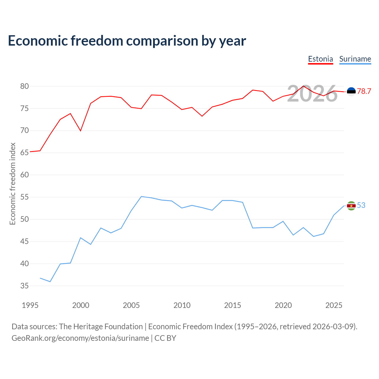 The Economic Freedom Index for Estonia is 78.7, ranking 10/197, compared to 53 for Suriname, ranking 143/197. The chart above displays a comparison of annual changes in economic freedom indexes.