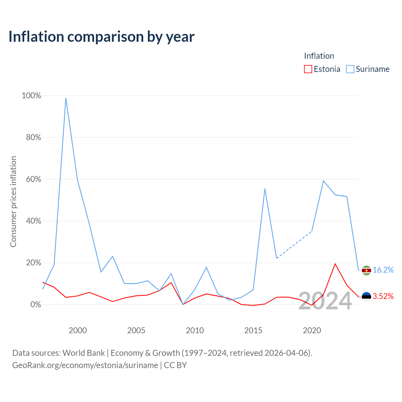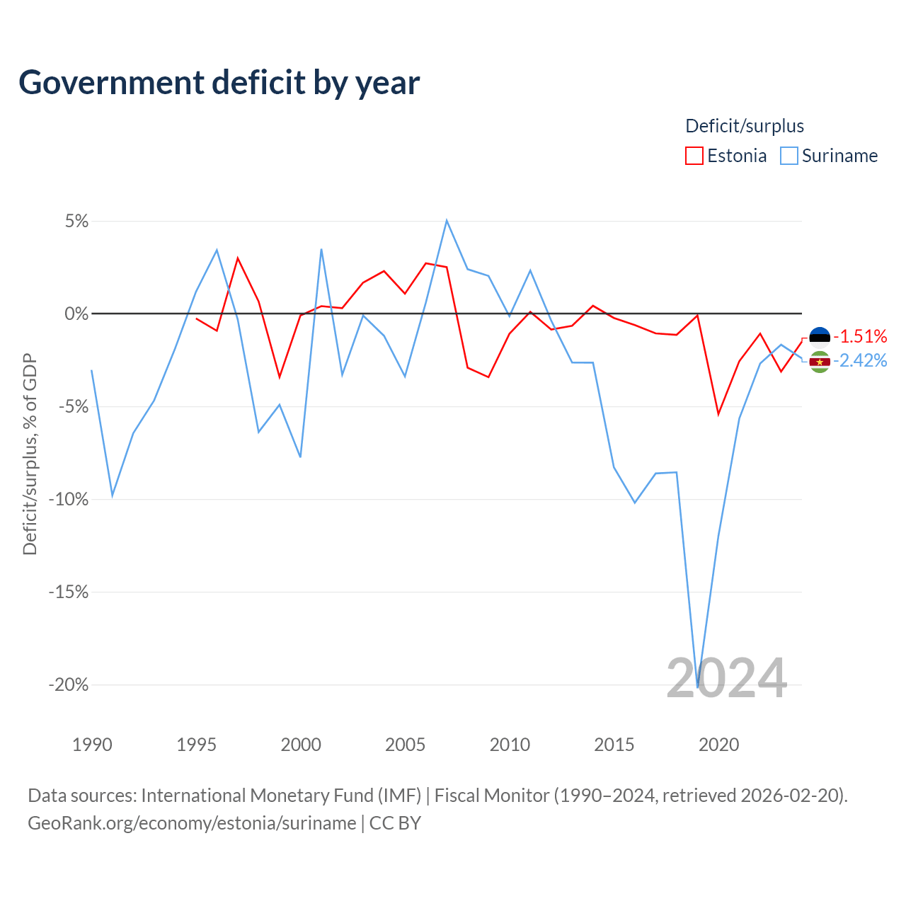 Estonia has a GDP of $43.1B compared to $4.42B for Suriname, ranking 100/197 and 164/197 by economy size, respectively.