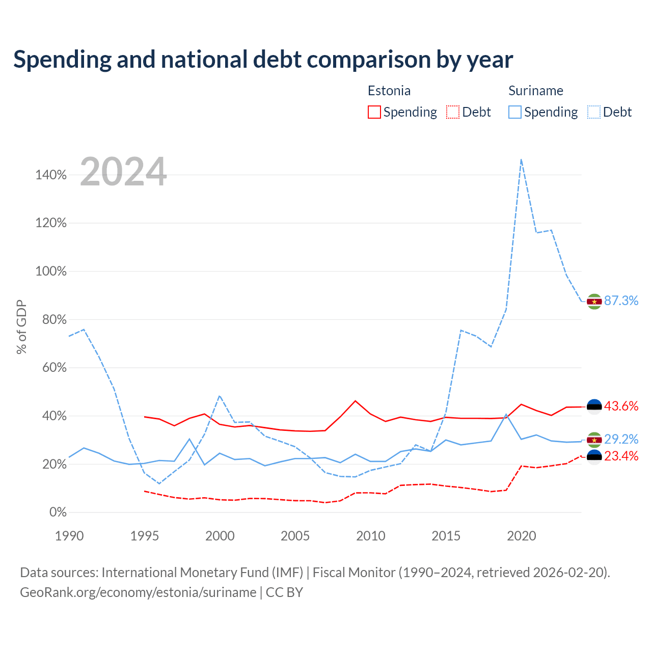 Estonia has $10.1B in government debt (23.4% of GDP), compared to $3.86B (87.3% of GDP) in Suriname.