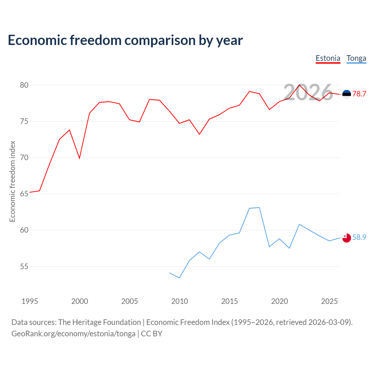 The Economic Freedom Index for Estonia is 78.7, ranking 10/197, compared to 58.9 for Tonga, ranking 107/197. The chart above displays a comparison of annual changes in economic freedom indexes.