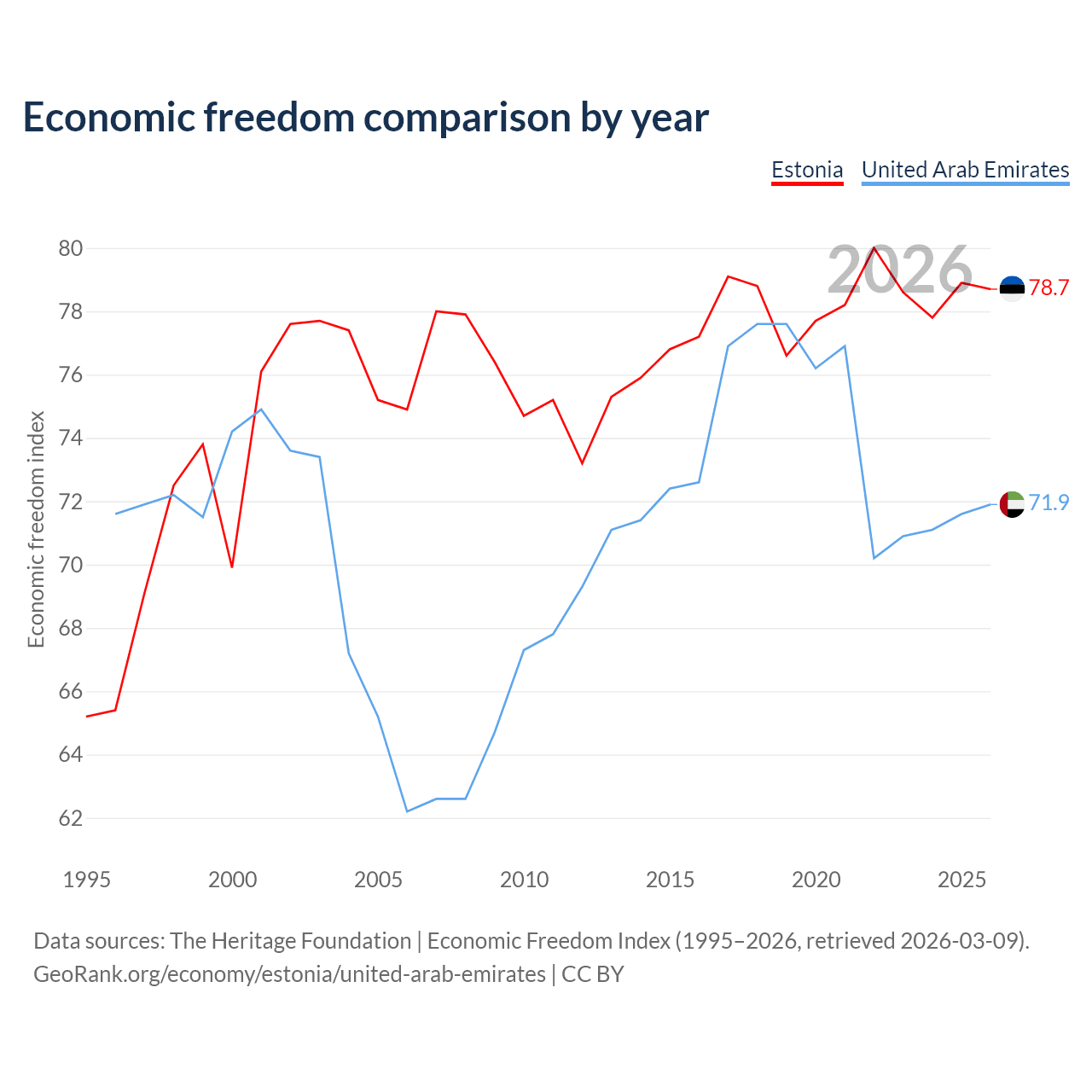 The Economic Freedom Index for Estonia is 78.7, ranking 10/197, compared to 71.9 for the United Arab Emirates, ranking 29/197. The chart above displays a comparison of annual changes in economic freedom indexes.