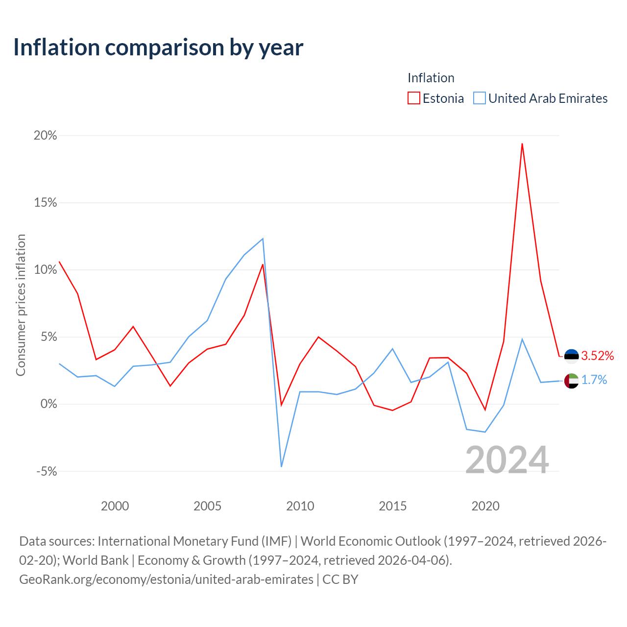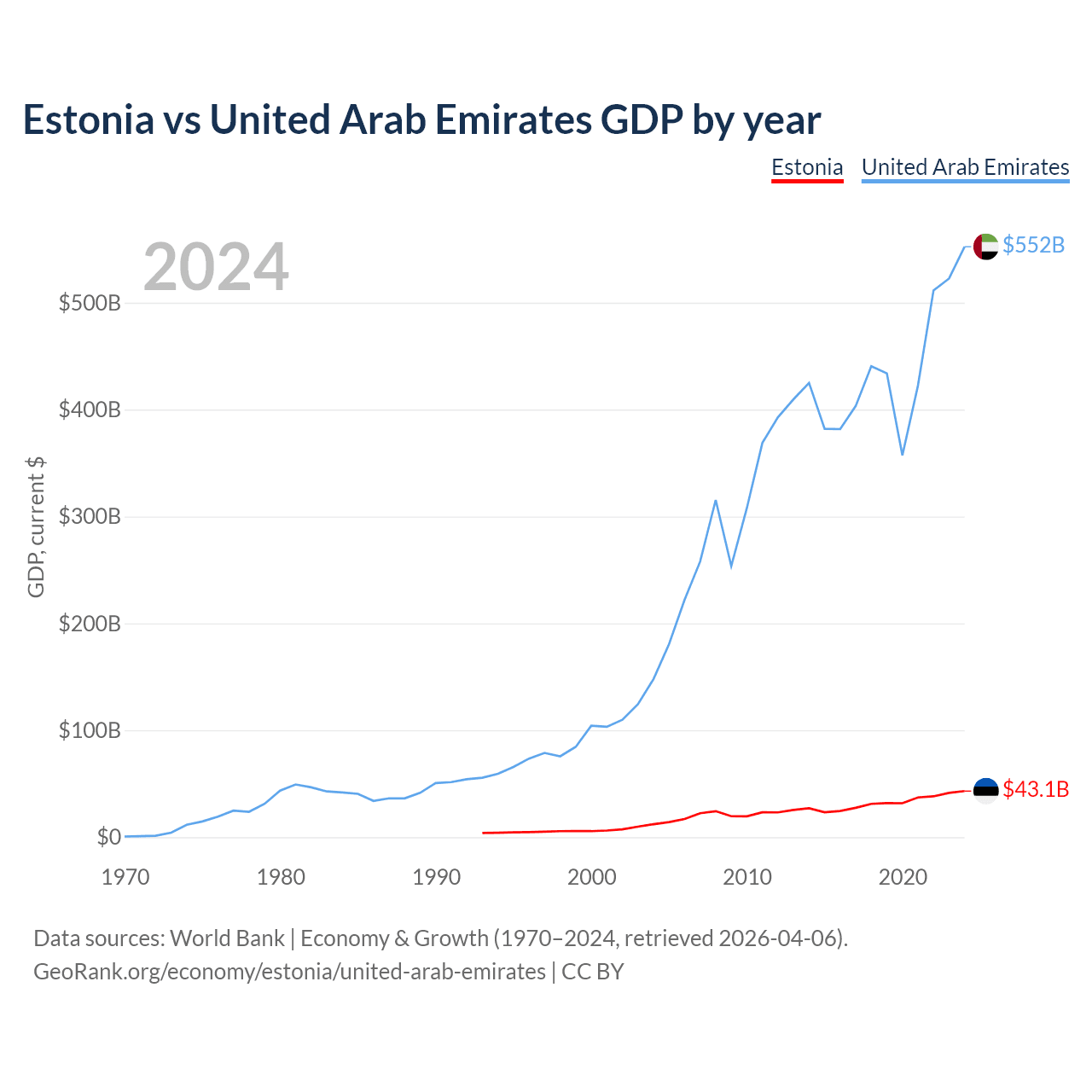 Estonia has a GDP of $43.1B compared to $552B for the United Arab Emirates, ranking 100/197 and 27/197 by economy size, respectively.