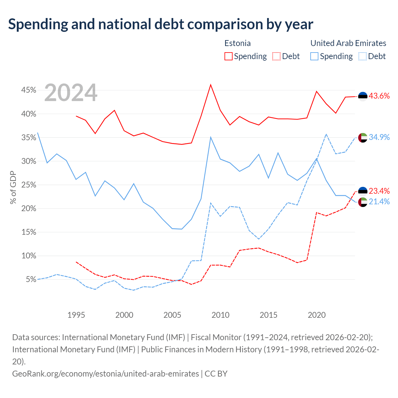 Estonia has $10.1B in government debt (23.4% of GDP), compared to $193B (34.9% of GDP) in the United Arab Emirates.