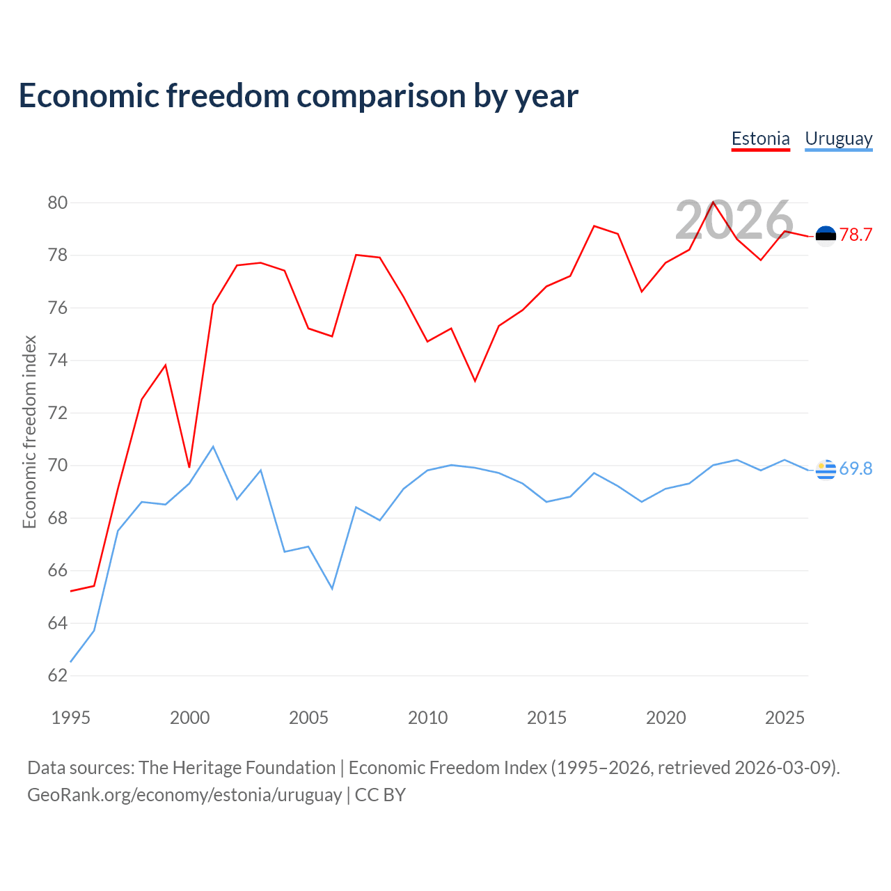 The Economic Freedom Index for Estonia is 78.7, ranking 10/197, compared to 69.8 for Uruguay, ranking 39/197. The chart above displays a comparison of annual changes in economic freedom indexes.