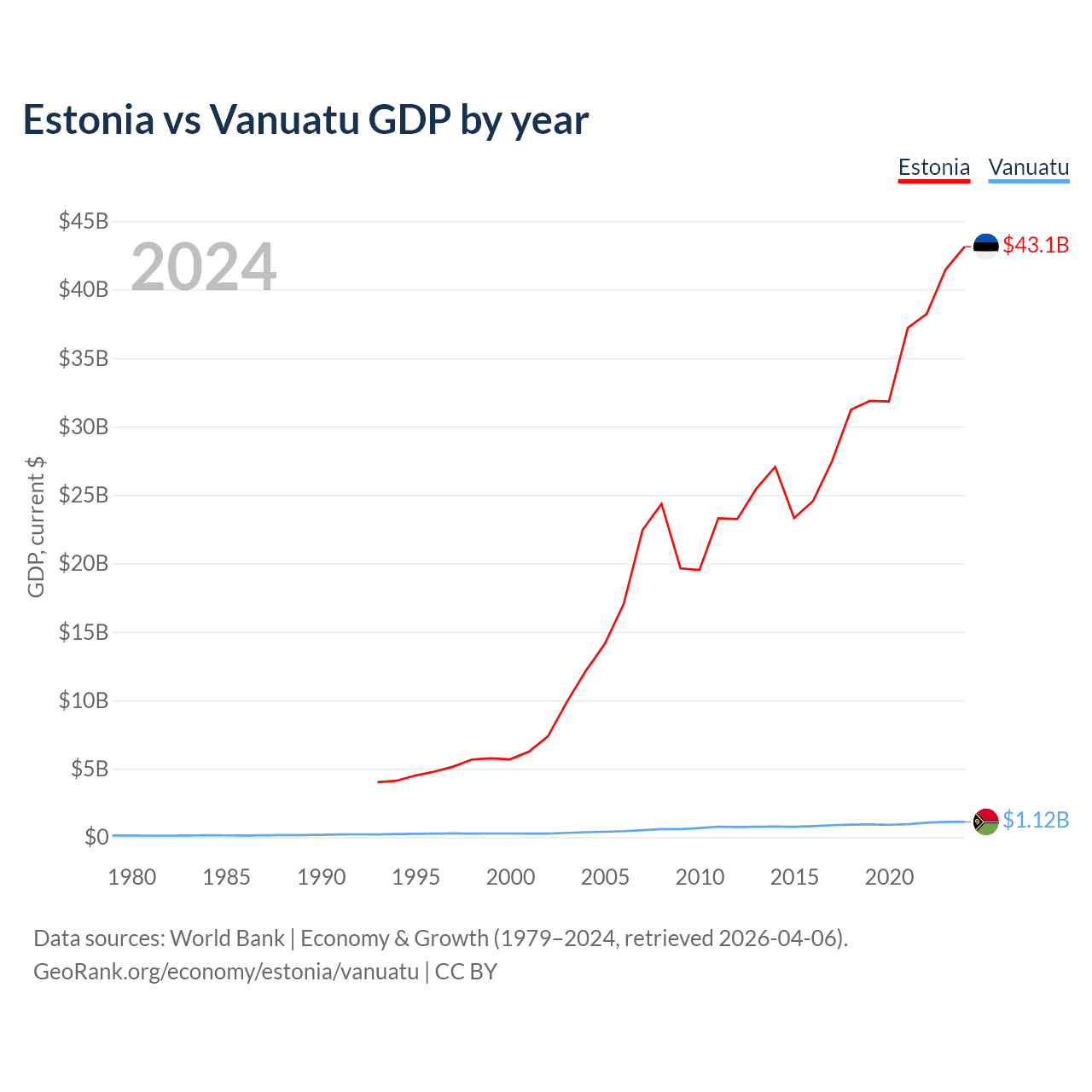 Estonia has a GDP of $43.1B compared to $1.12B for Vanuatu, ranking 100/197 and 188/197 by economy size, respectively.