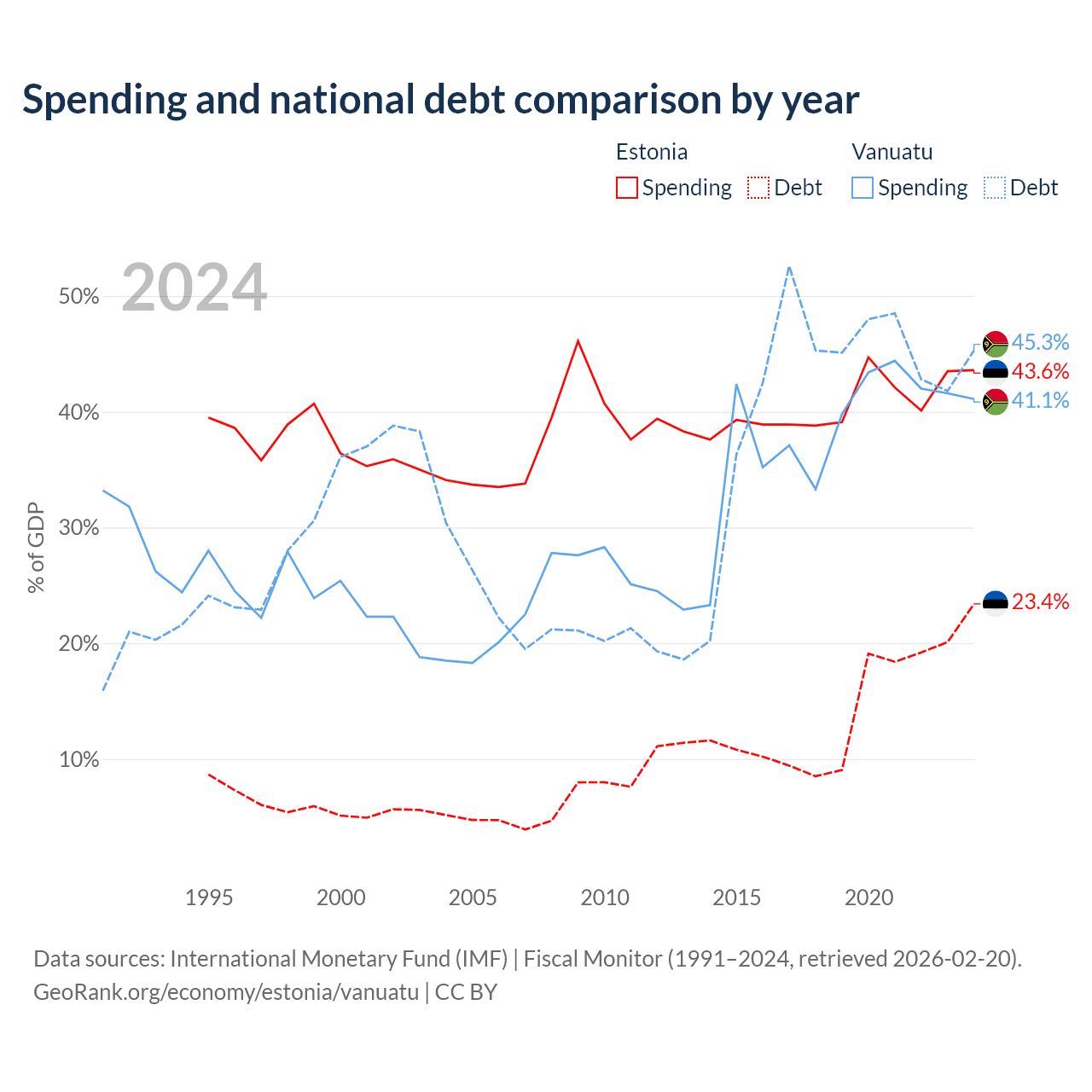Estonia has $10.1B in government debt (23.4% of GDP), compared to $507M (45.3% of GDP) in Vanuatu.