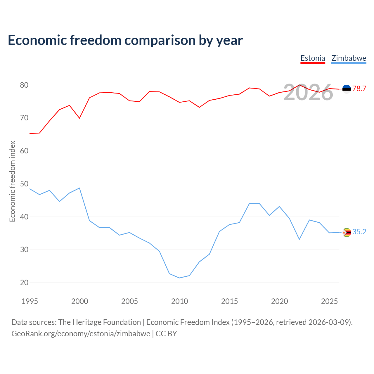 The Economic Freedom Index for Estonia is 78.7, ranking 10/197, compared to 35.2 for Zimbabwe, ranking 190/197. The chart above displays a comparison of annual changes in economic freedom indexes.