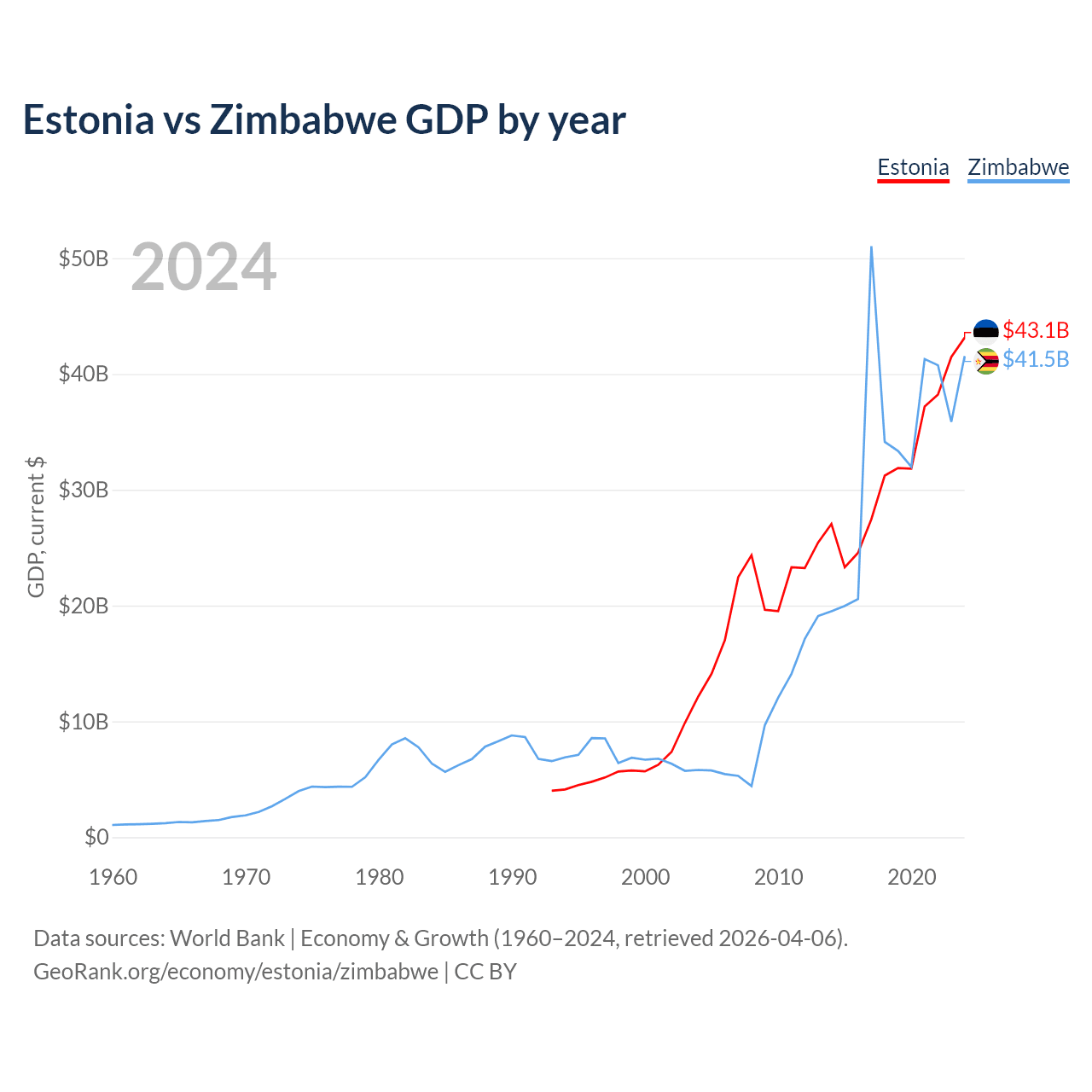 Estonia has a GDP of $43.1B compared to $41.5B for Zimbabwe, ranking 100/197 and 102/197 by economy size, respectively.