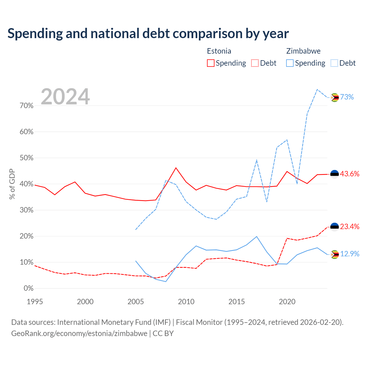 Estonia has $10.1B in government debt (23.4% of GDP), compared to $30.3B (73% of GDP) in Zimbabwe.