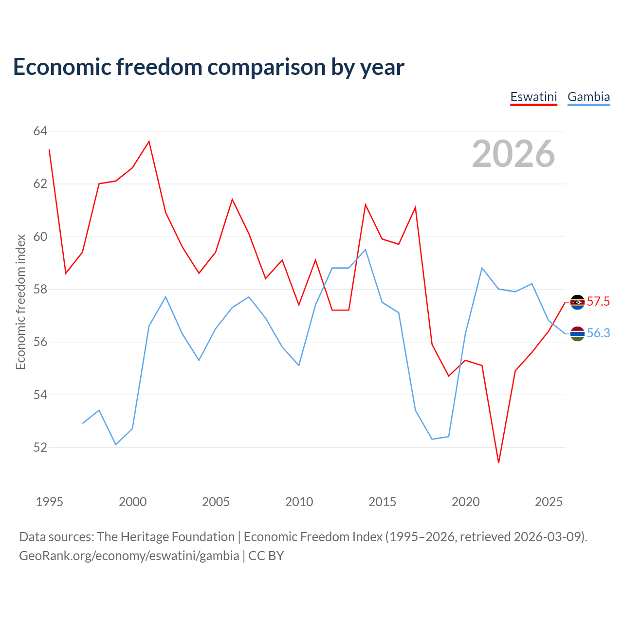The Economic Freedom Index for Eswatini is 57.5, ranking 116/197, compared to 56.3 for the Gambia, ranking 123/197. The chart above displays a comparison of annual changes in economic freedom indexes.