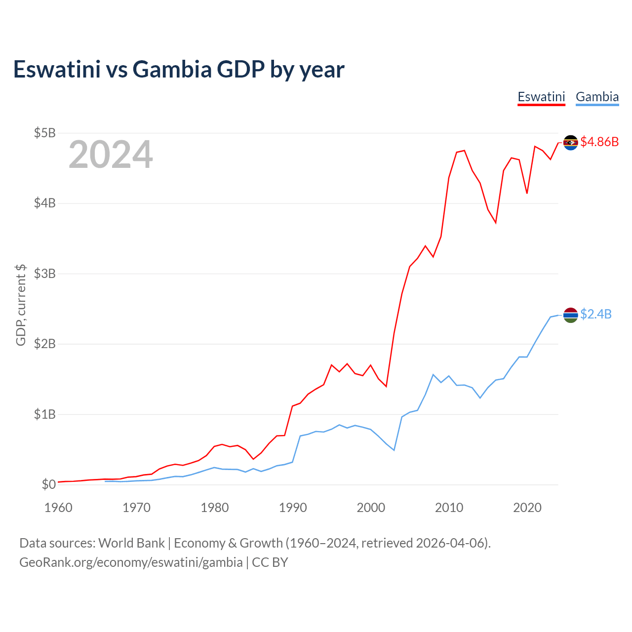 Eswatini has a GDP of $4.86B compared to $2.4B for the Gambia, ranking 162/197 and 174/197 by economy size, respectively.
