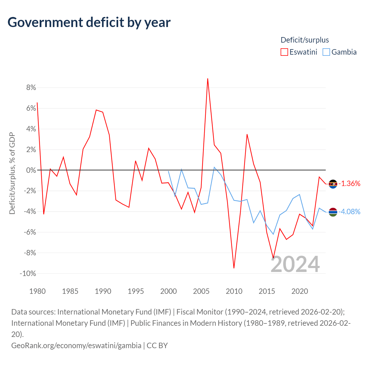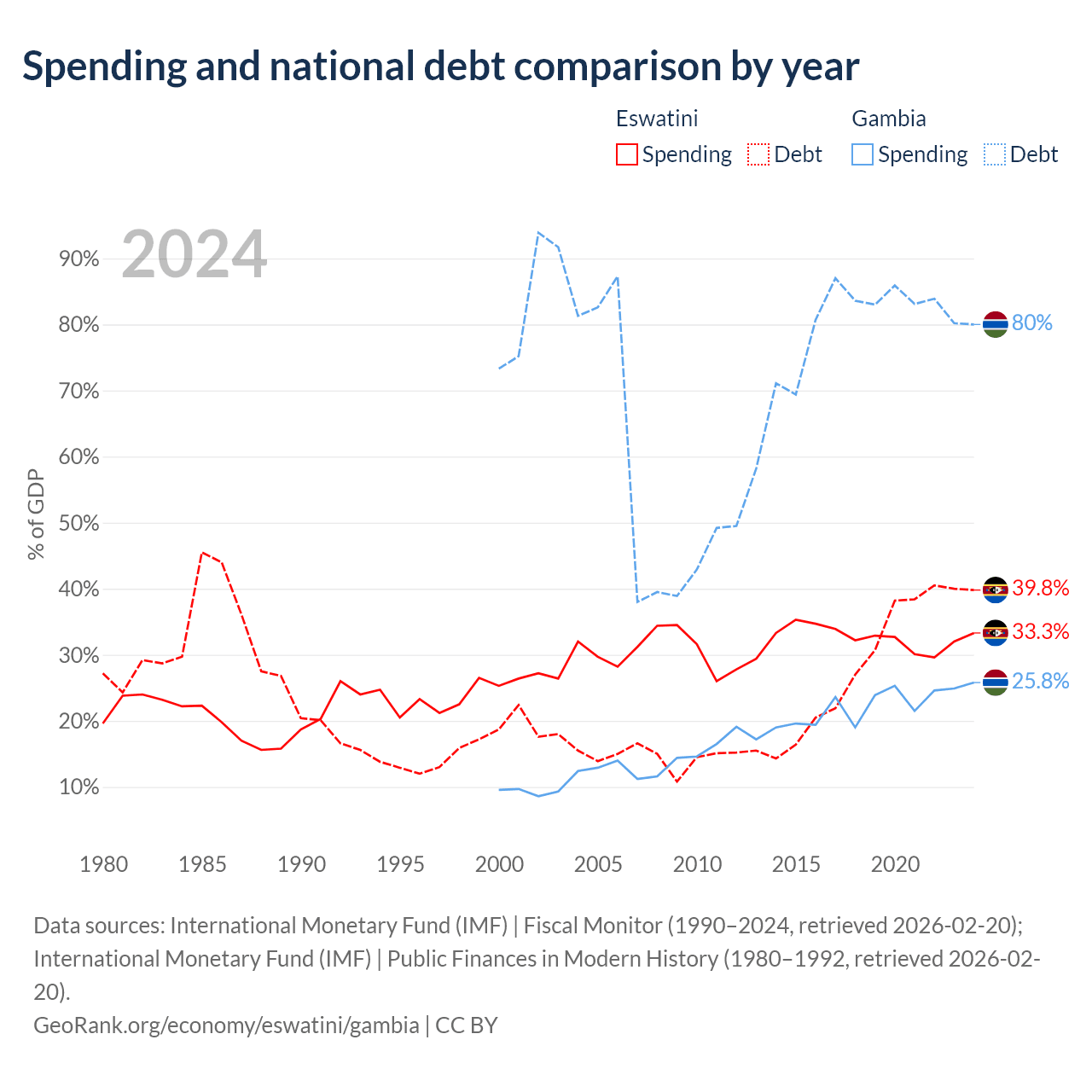 Eswatini has $1.93B in government debt (39.8% of GDP), compared to $1.92B (80% of GDP) in the Gambia.